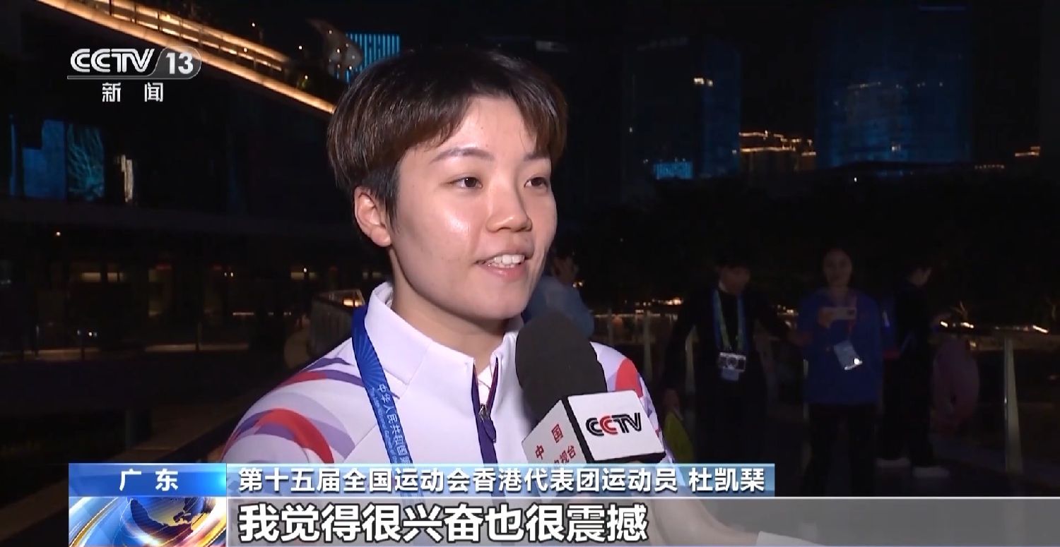 第十五届全国运动会香港代表团运动员杜凯琹:我觉得很兴奋,也很震撼。首先我自己真的是非常荣幸,可以做香港的旗手代表,真的是深感荣幸,因为开幕的时候是粤港澳的运动员一起去点亮圣火,闭幕的时候我们运动员也是粤港澳地区一起最后走出来,这一次全运会我觉得真的是把我们连在一起,也祝福祖国越来越好。