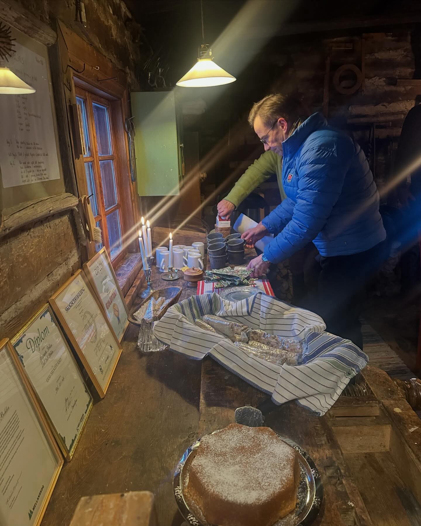 I skogarna utanförÄlvdalen lyste en stuga från1600-talet av stearinljus och nybakat bröd.Statsministern samtalade med familjeföretagetsägare och studerade en gammal kartaöver bygden.