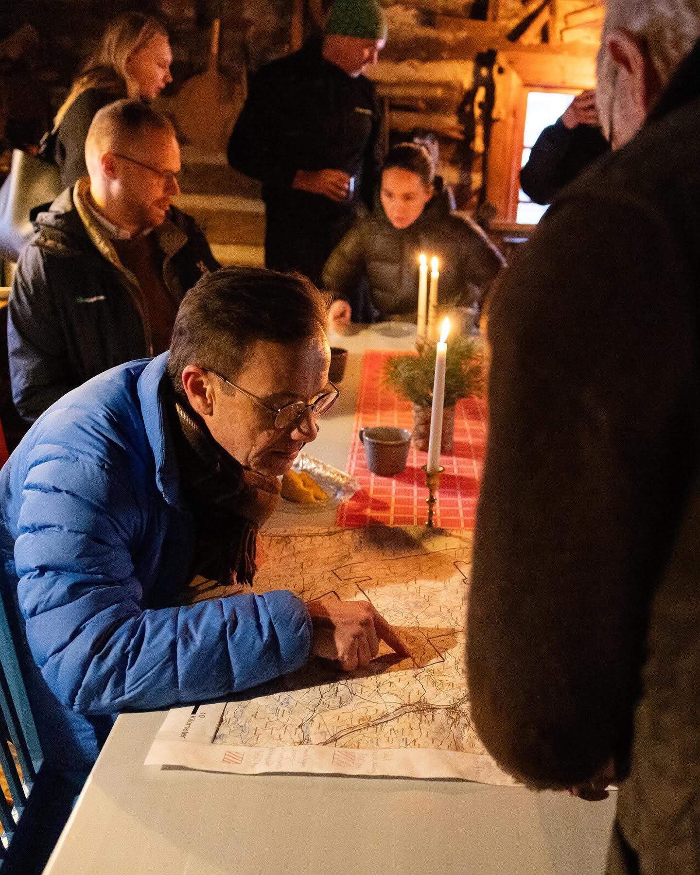行程来到Älvdalen的森林深处,一座17世纪木屋散发着烛光与烘焙香气。首相在木桌前听家庭企业的故事,指着一张古老地图,与当地人热烈交谈。