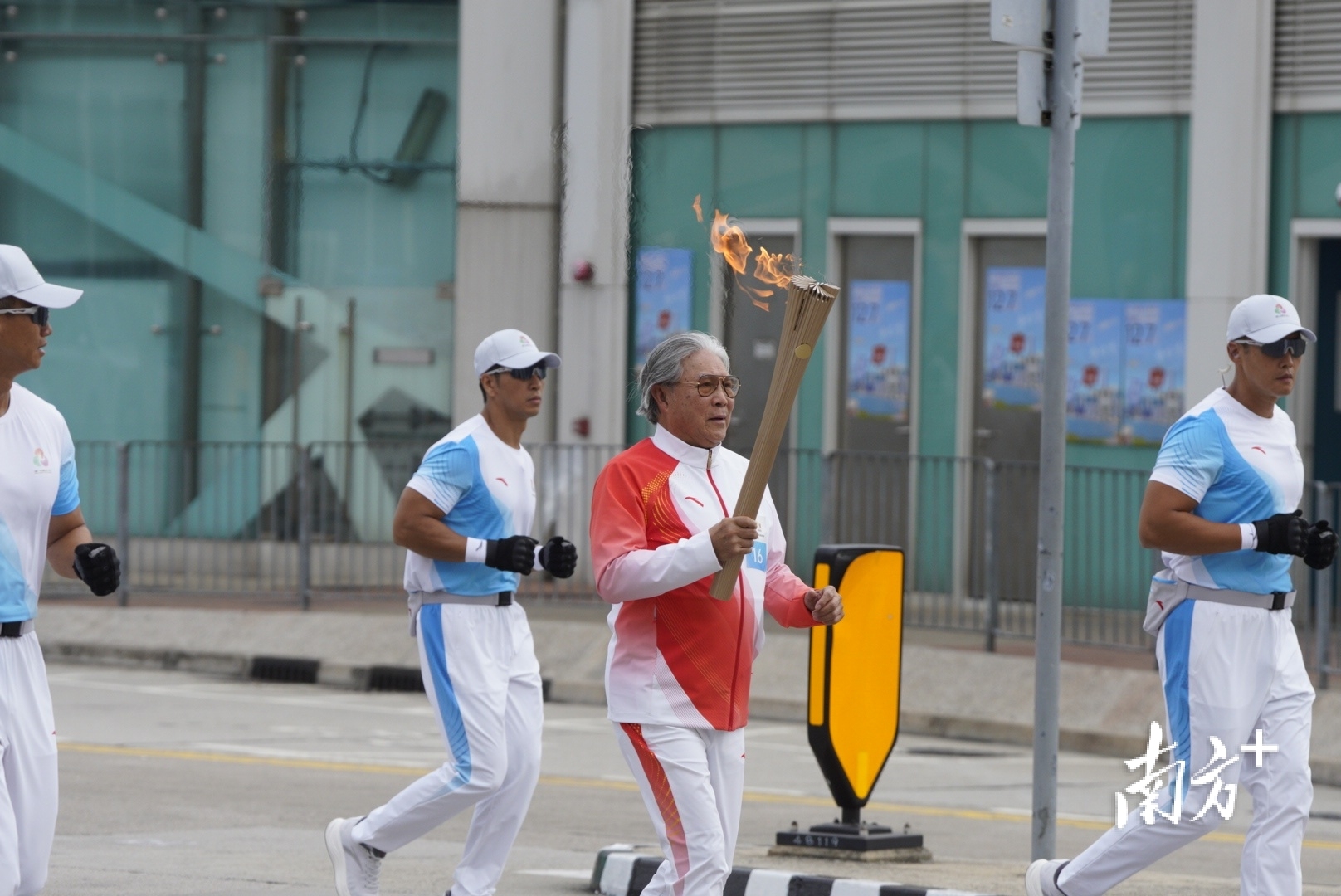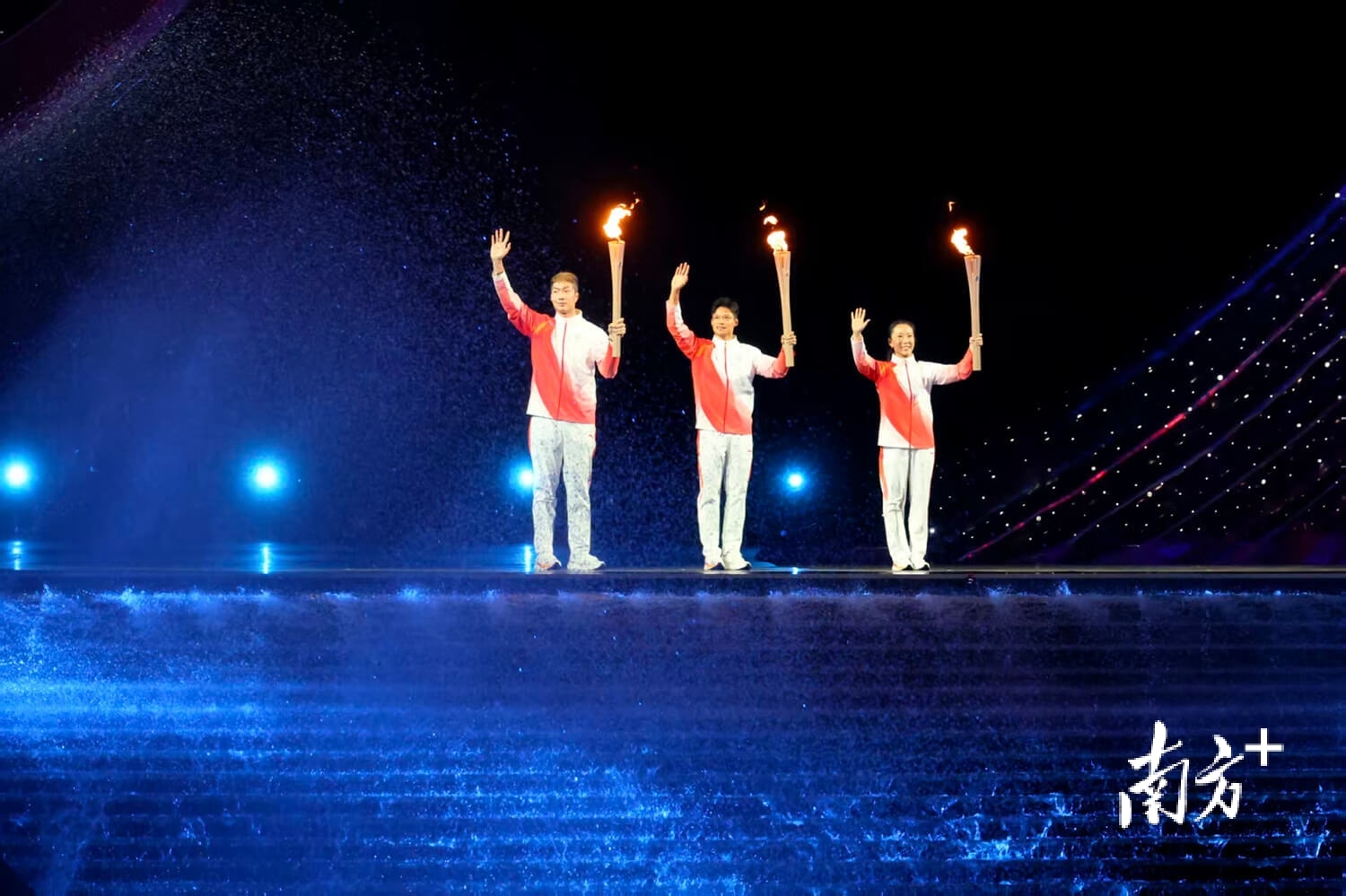 11月9日,开幕式现场,最后一棒火炬是由广东、香港、澳门三地的火炬手苏炳添、张家朗、李祎共同完成。南方+记者郑新洽摄