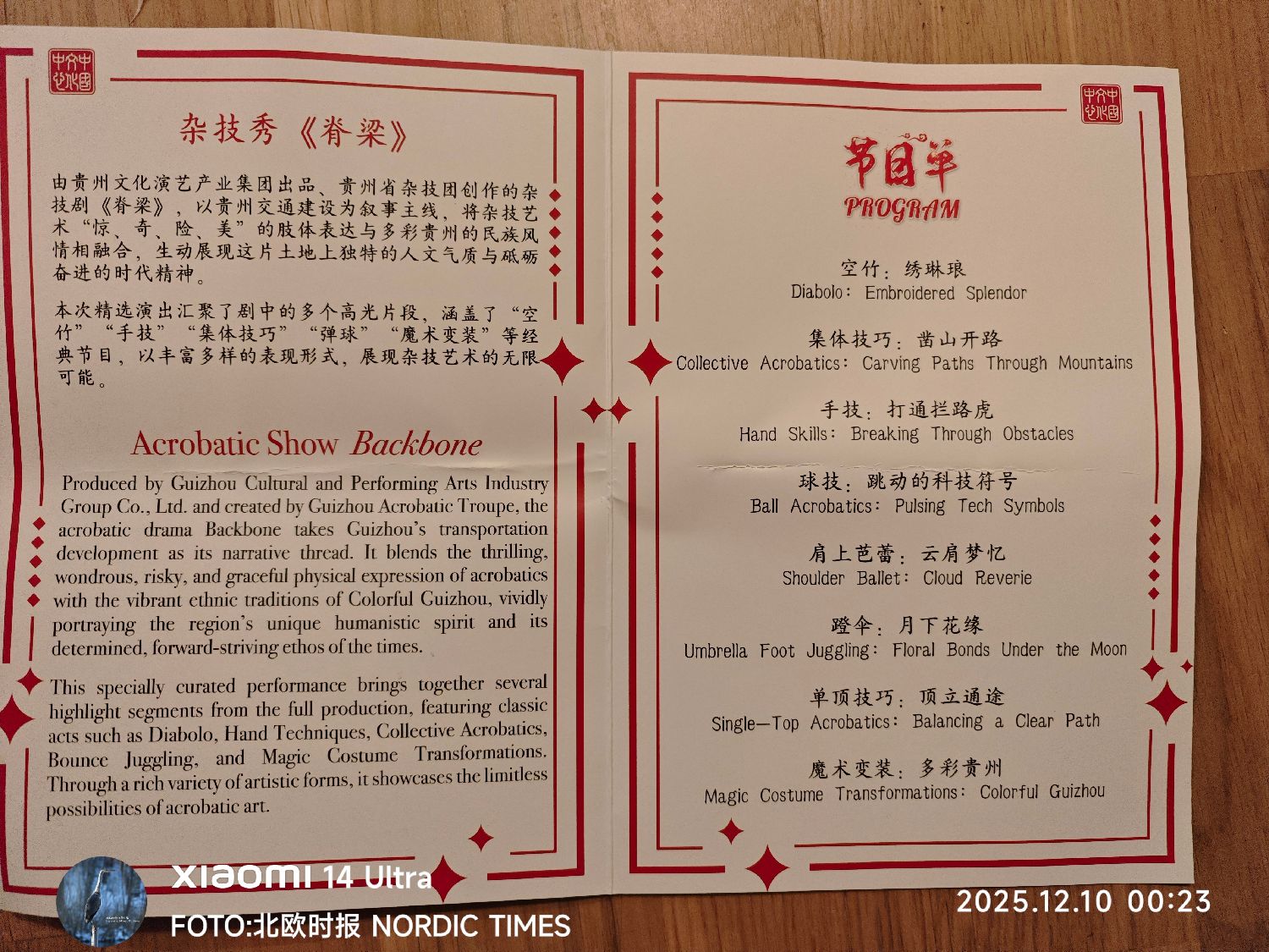 (本报斯德哥尔摩讯)斯德哥尔摩的冬夜静得像雪落前的一秒,而中国贵州的山歌、鼓点和惊心动魄的杂技艺术,在这座北欧城市的中心,突然点燃了沉静的空气。12月9日晚,斯德哥尔摩新马戏剧场(Nya Cirkus),红色座椅像铺展开的火焰,观众席早已坐满、灯光打亮,每一张脸都带着期待。掌声在演出尚未开始时便已涌动,像潮水在黑暗中挣脱束缚。