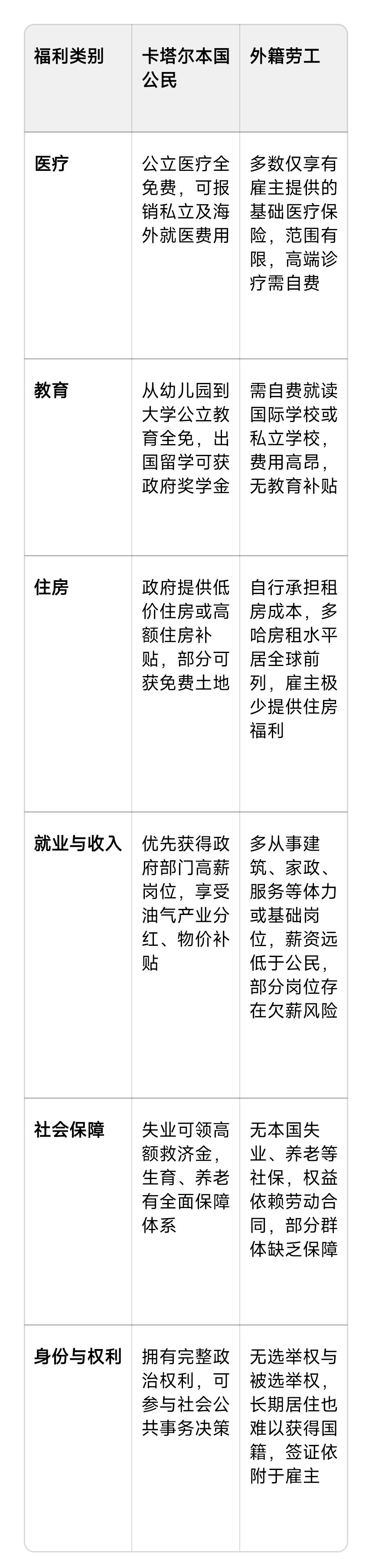 卡塔尔公民约占总人口10%-15%(约30-40万人),凭借油气财富享受从教育、医疗到住房、结婚、失业的“从摇篮到坟墓”福利,贫困率接近零,人均收入极高。