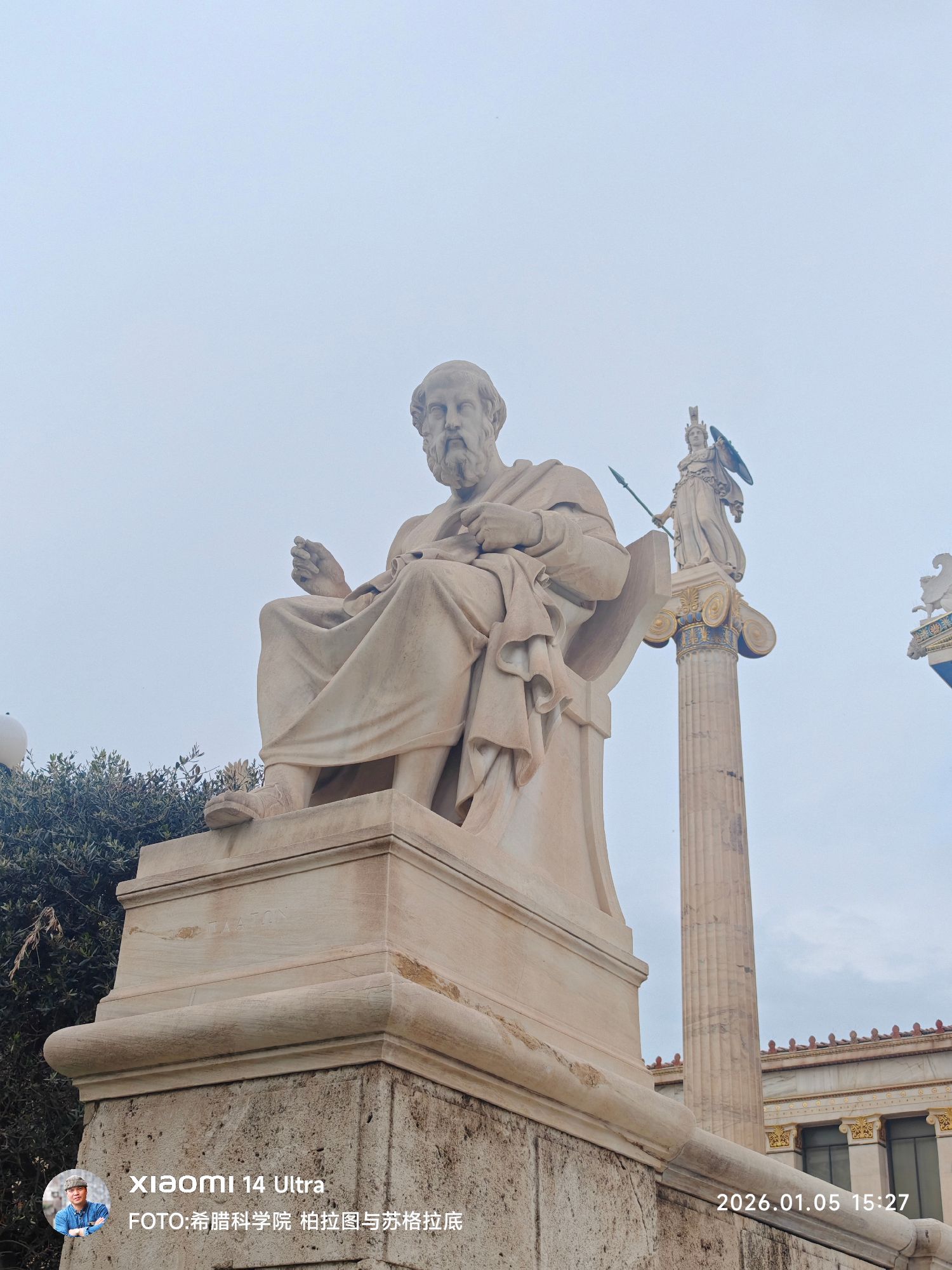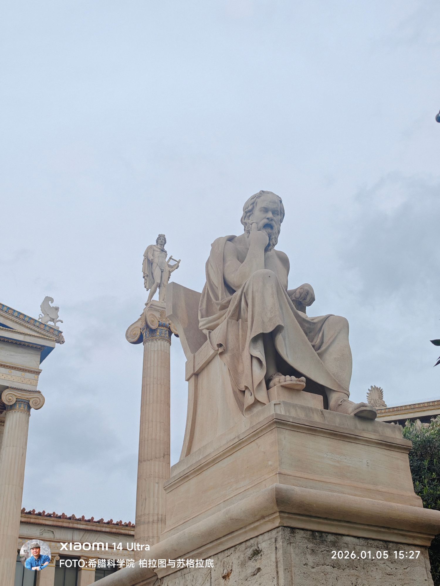 在台阶上,苏格拉底与柏拉图并肩而坐,静默地注视着来自世界各地的访客。两尊雕像的并置,本身便是一种深刻的文明隐喻: