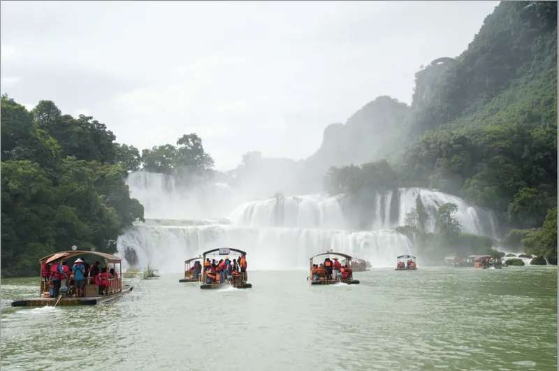 游客在位于广西崇左市大新县的跨境旅游合作区——中越德天(板约)瀑布跨境旅游合作区乘船观光。 中新社记者 陈冠言摄