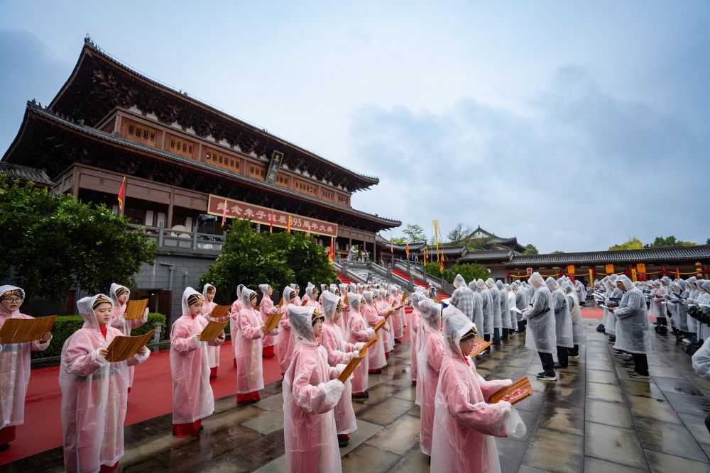 2025年11月4日,农历乙巳年九月十五日,纪念朱子诞辰895周年大典在福建南平建阳考亭书院举行。海内外朱子后裔、儒学专家学者及社会各界代表齐聚考亭,缅怀先贤朱子。大典遵循传统礼仪,依次开展开殿、初献、亚献、终献、敬献花篮等环节。仪式尾声,百名学生与全体与祭者共同恭诵《朱子家训》。图为活动现场。(图片来源:本文图片均自中新社)