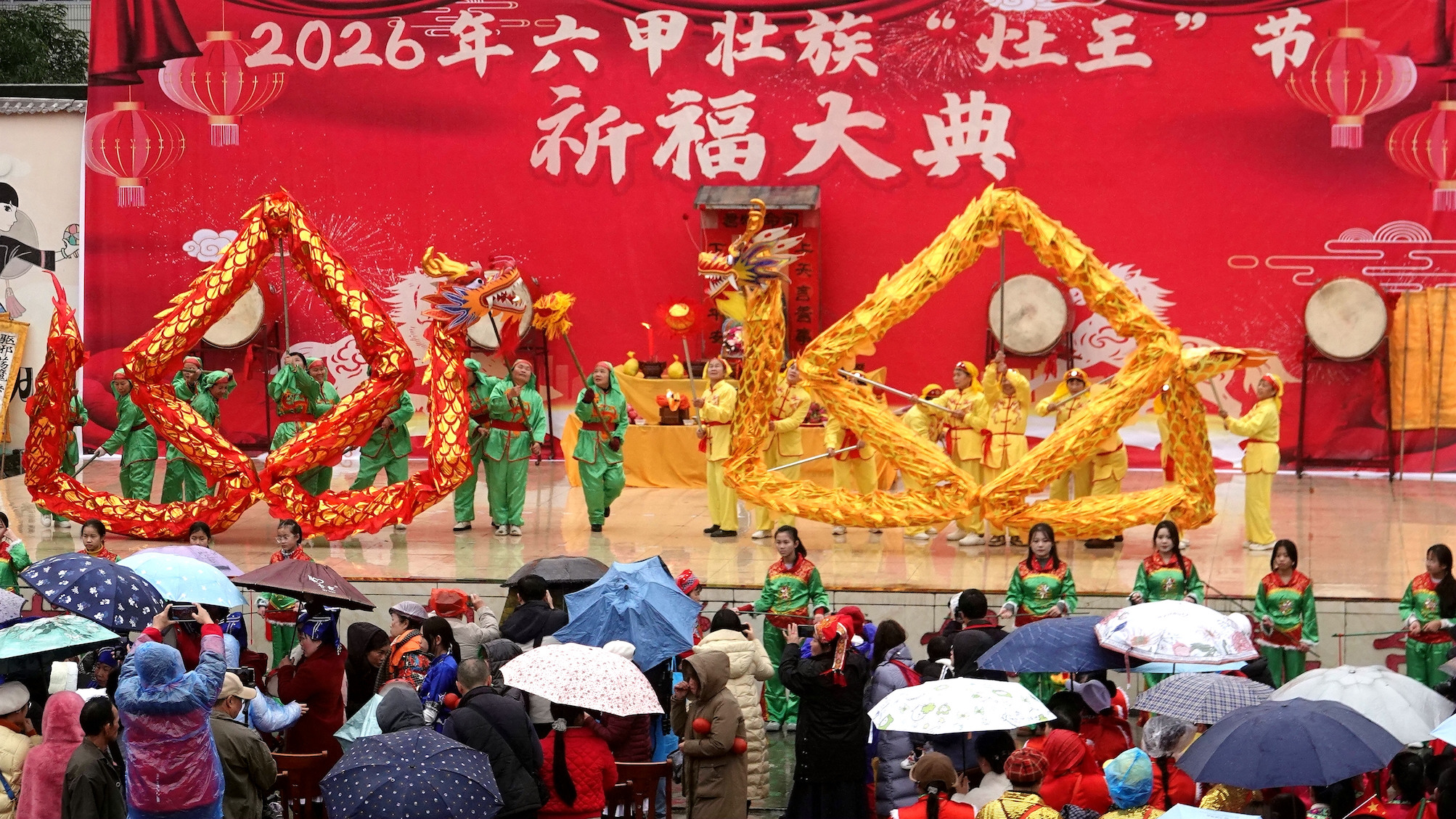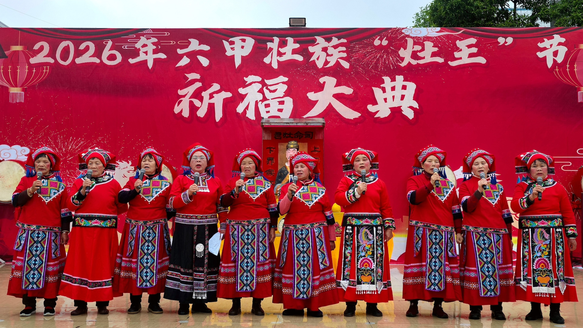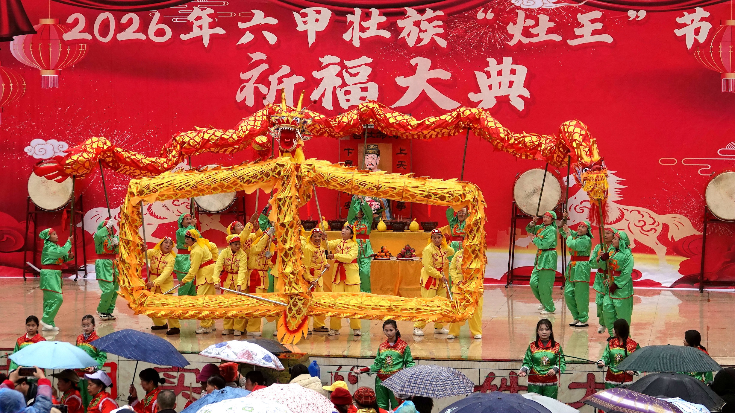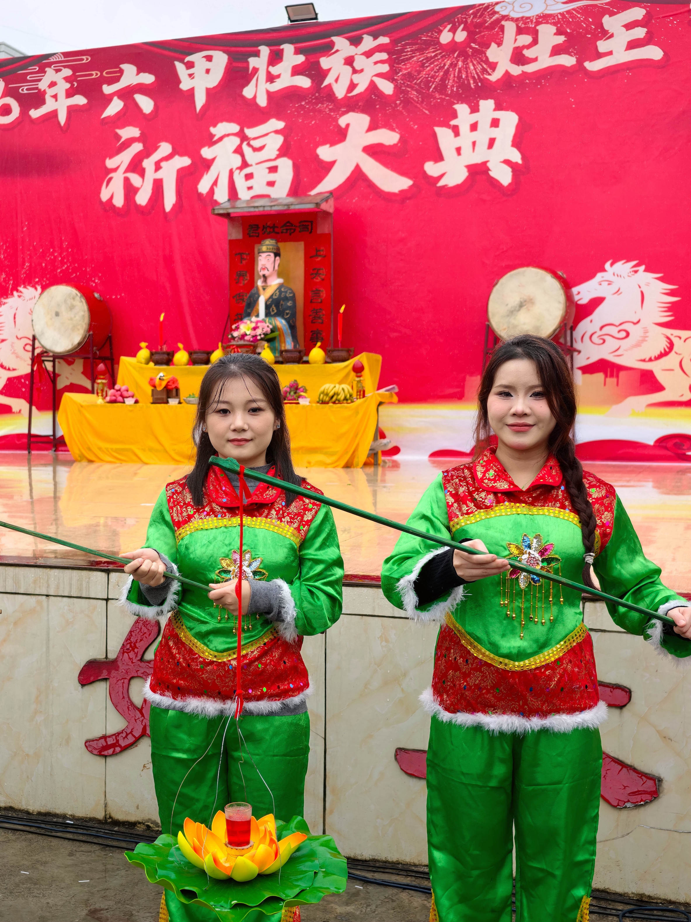 当天细雨濛濛,六甲镇群山云雾缭绕,山水相映如诗如画。11时30分,壮族“灶王”节在热闹的舞龙舞狮中拉开帷幕。当地群众遵循传统习俗,请灶王、点灶火、烹佳肴,抬着灶王像巡游村寨,把平安吉祥、福禄寿喜送到千家万户。活动最后,各族群众欢聚一堂,共品灶王节特色美食,在欢声笑语中度过温馨祥和的小年。 2月10日,当地群众在广西河池市金城江区六甲壮族“灶王”节点燃莲花灯。
