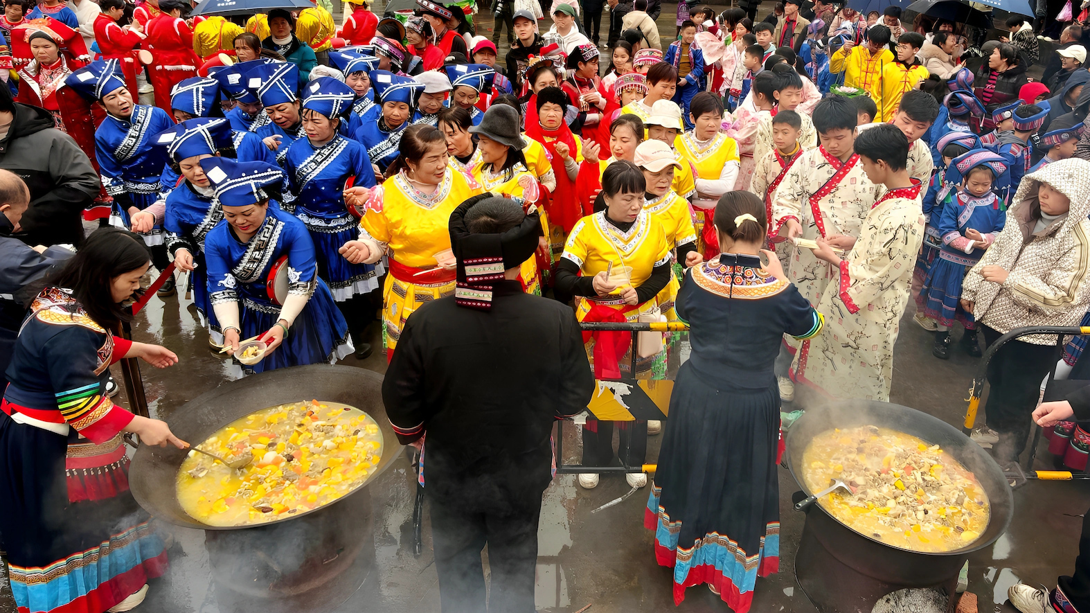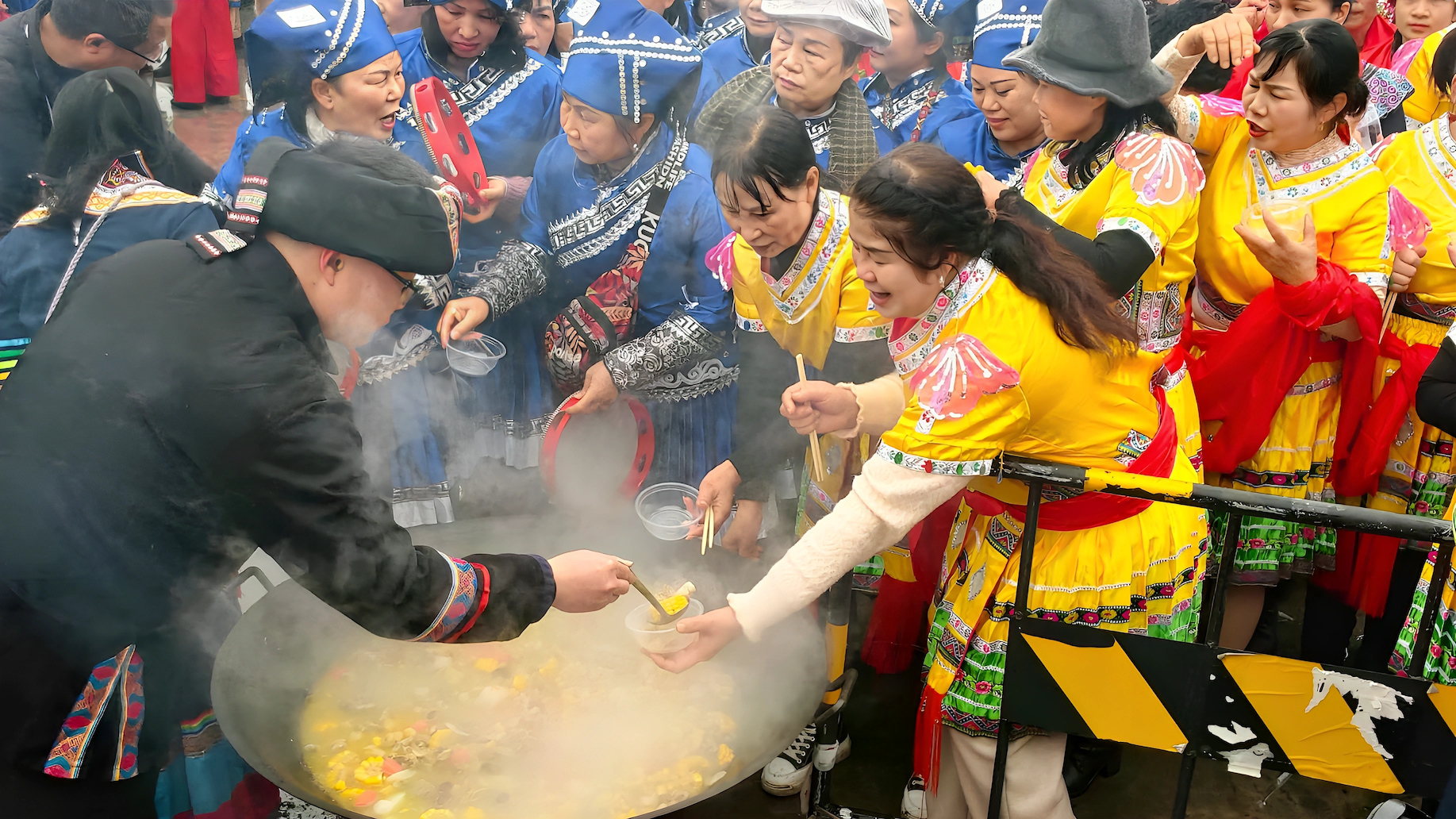 2月10日,广西河池市金城江区六甲壮族“灶王”节第一锅菜肴热气腾腾出锅。