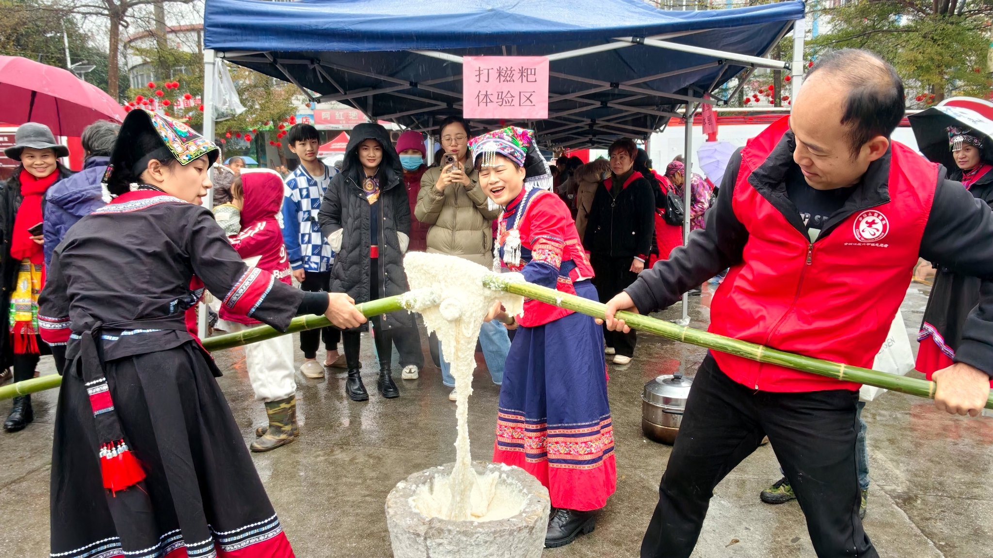 2月10日,当地群众在广西河池市金城江区六甲壮族“灶王”节一起打糍粑。