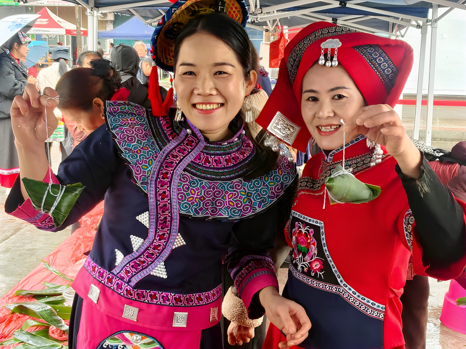 2月10日,当地群众在广西河池市金城江区六甲壮族“灶王”节展示壮族粽子。