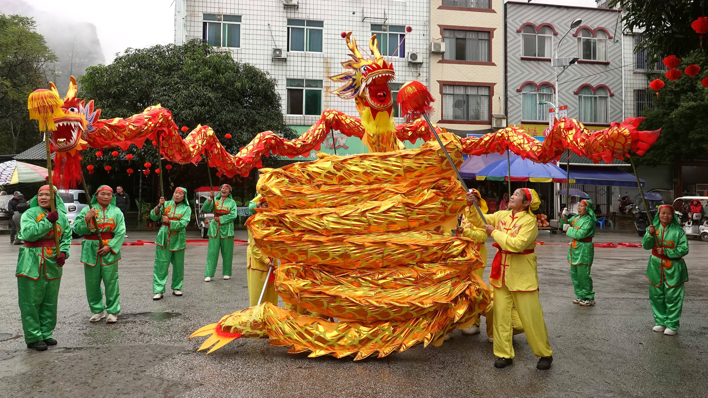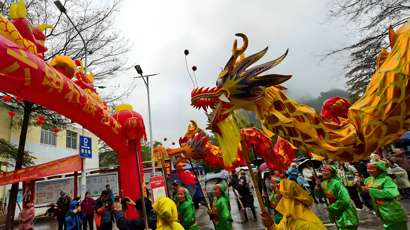 2月10日,广西河池市金城江区六甲壮族“灶王”节巡游舞龙表演。