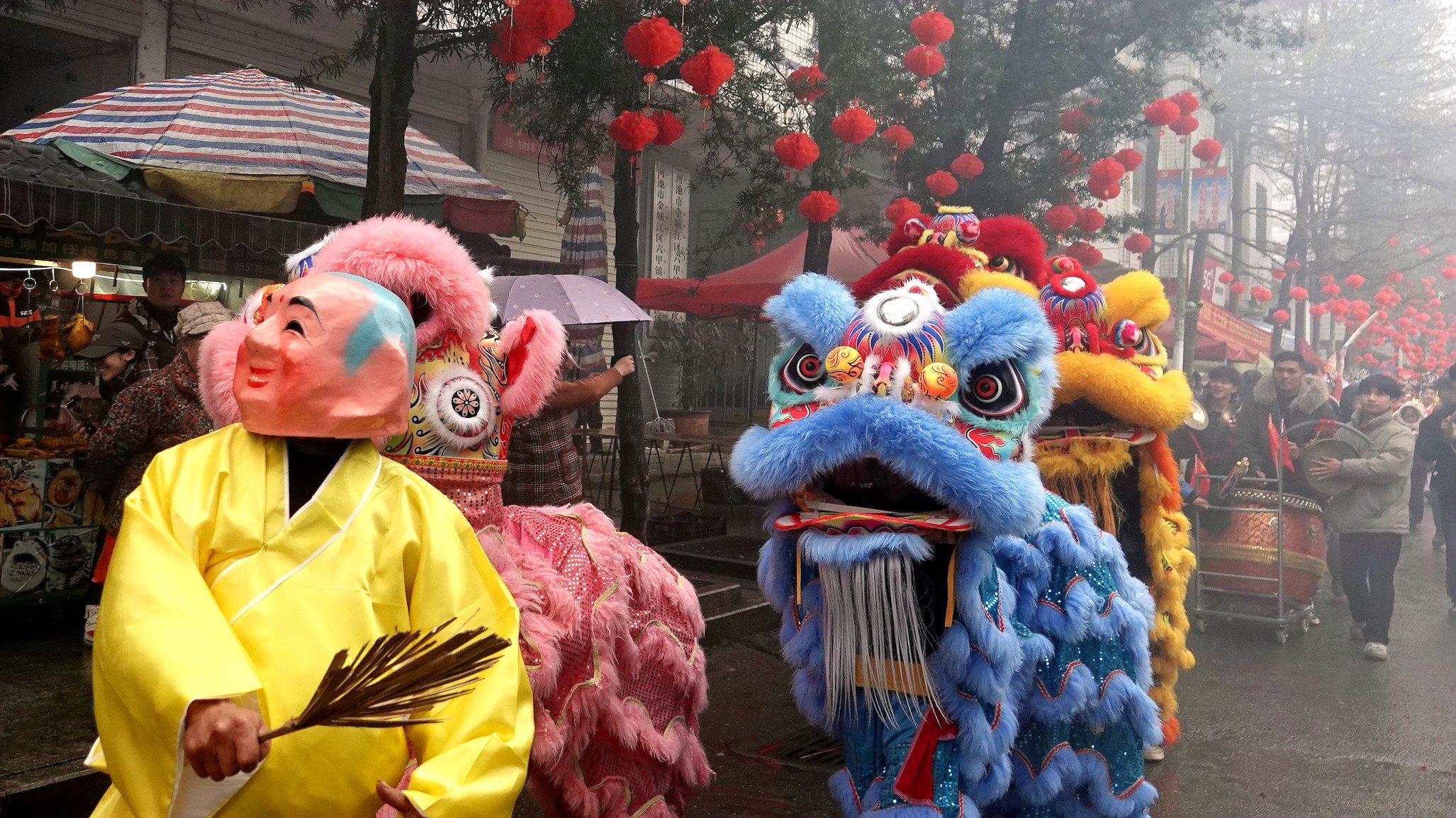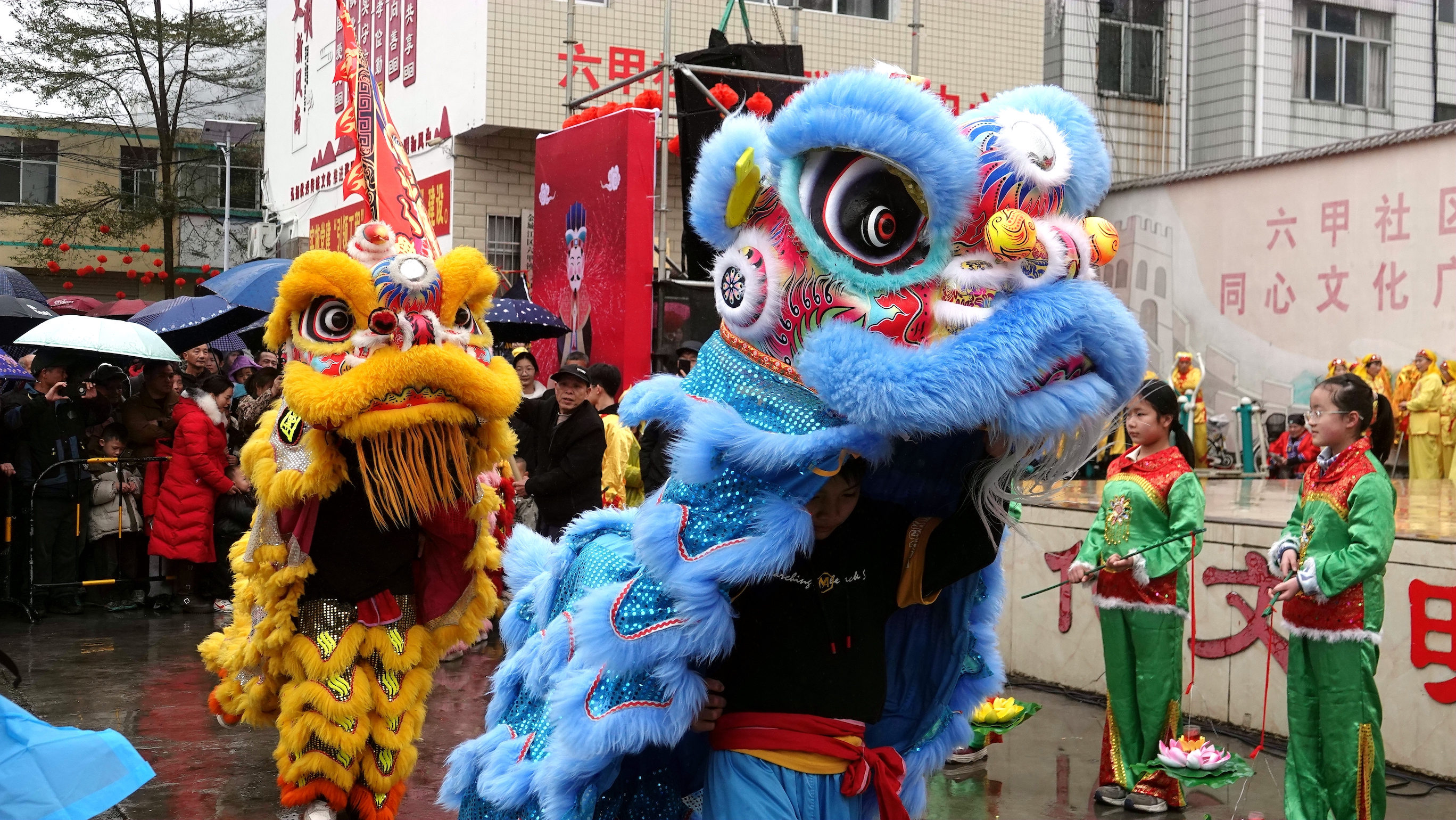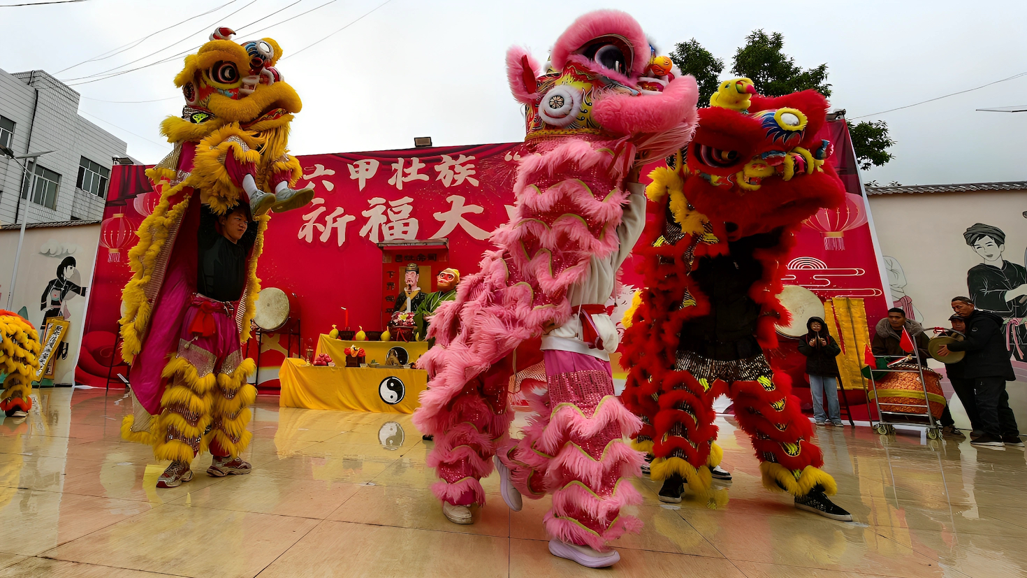 2月10日,广西河池市金城江区六甲壮族“灶王”节上舞狮表演。