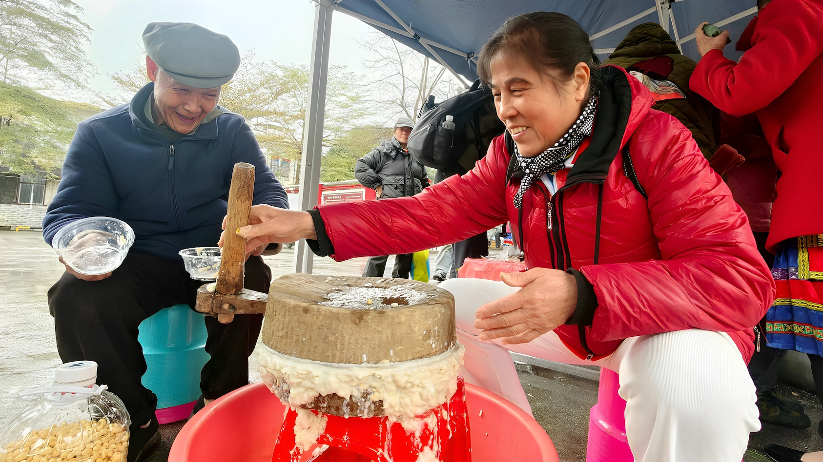 2月10日,广西河池市金城江区六甲壮族“灶王”节手工磨豆浆。