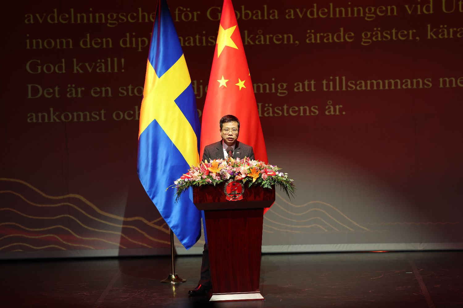 The theater was filled to capacity.As the lights dimmed, the curtain slowly rose to the solemn melodies of the national anthems of China and Sweden.Acting Chargéd’Affaires Wan Degang delivered a warm and inspiring speech, extending heartfelt New Year greetings to all guests.