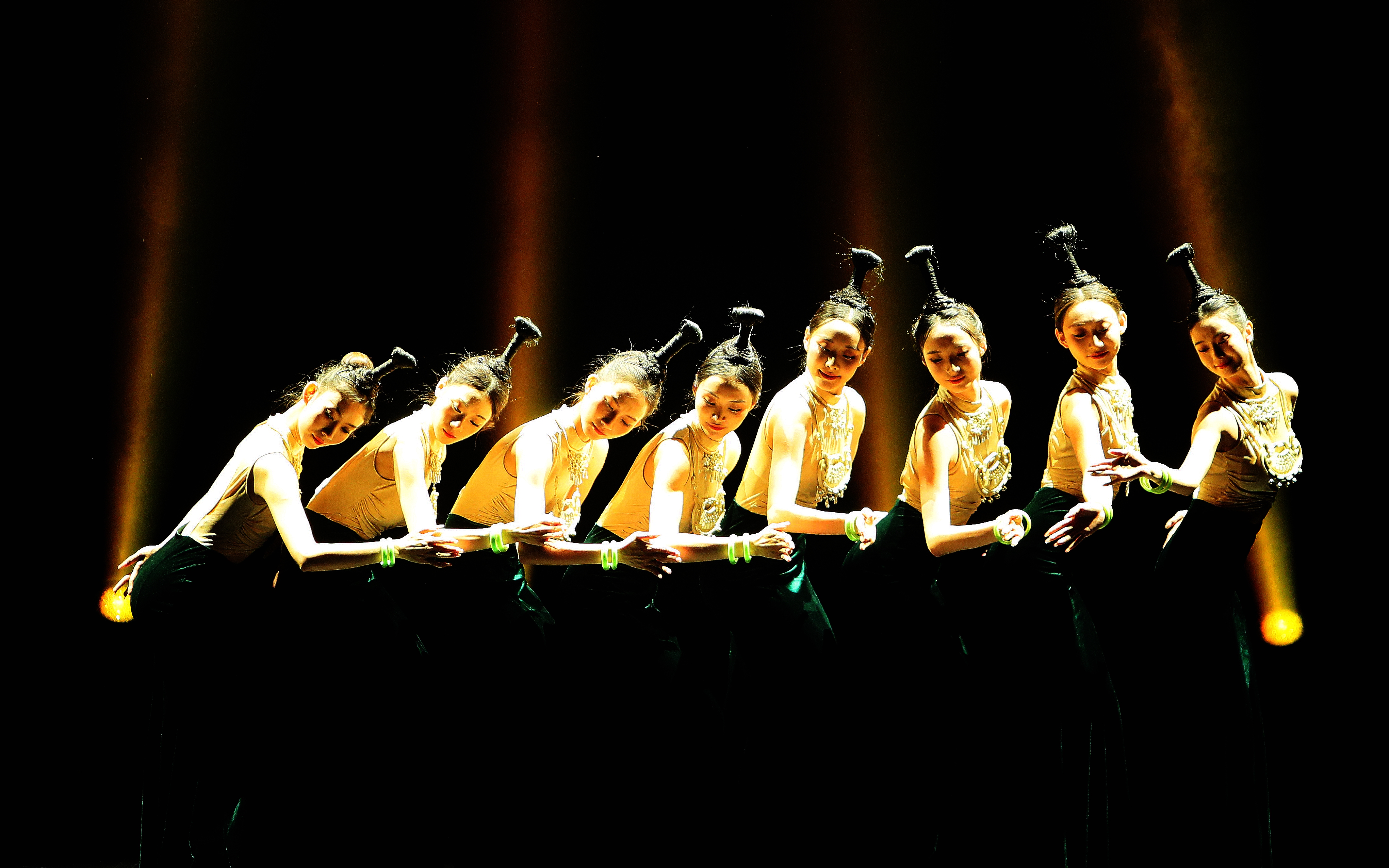 舞蹈《比镯》以翡翠玉镯为形,通过手腕的细腻流转与环形队形的起伏,演绎玉石从天然至温润的蜕变。轻盈纱袖随乐飘摇,如环佩生光,在东方身韵与现代编舞的交融中,传递如玉般柔韧坚贞的东方气质。