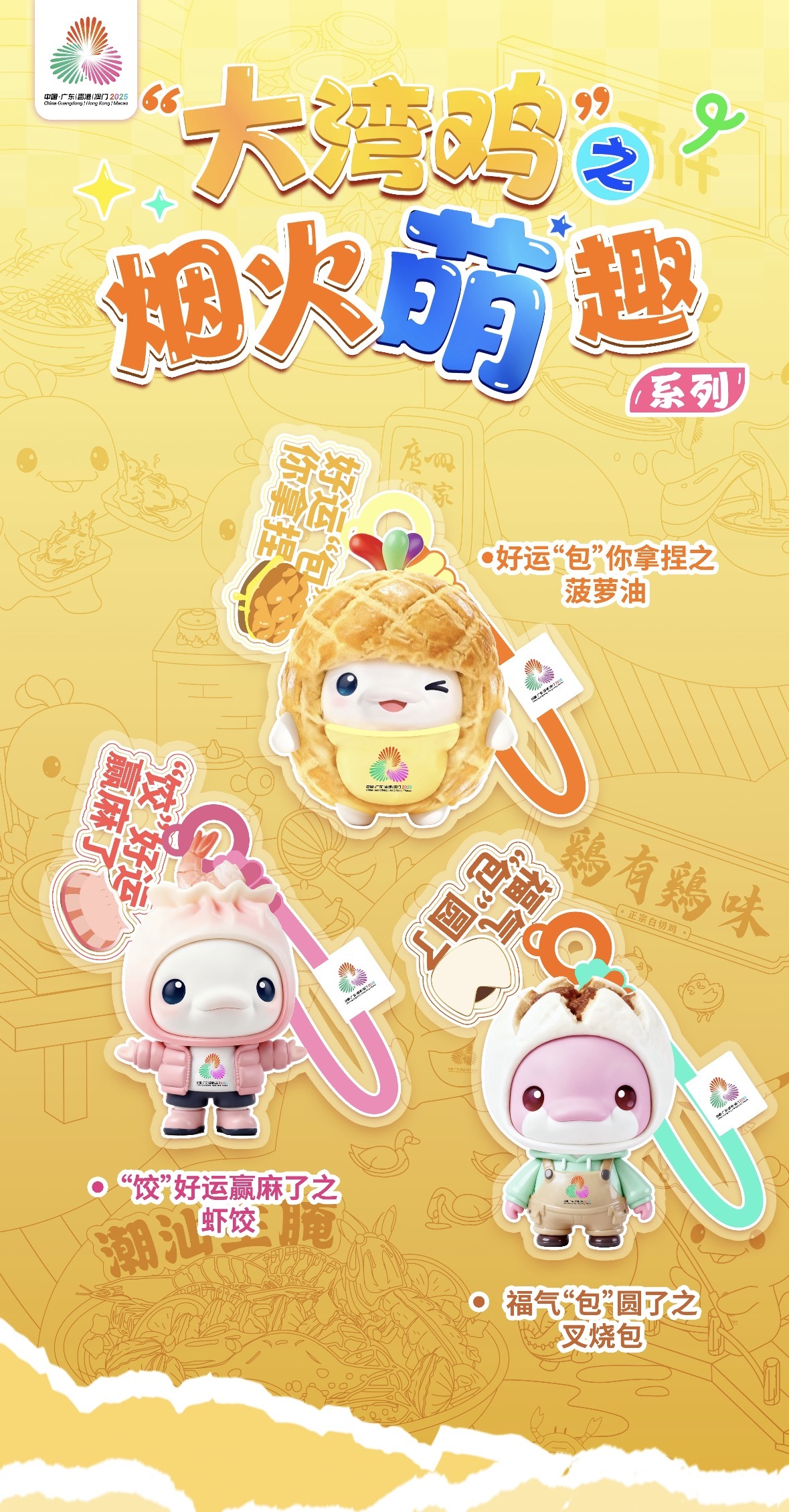 官方的文创产品当然不能落下。2026“烟火萌趣”系列文创零食挂件,把经典粤味和吉祥话一起打包:
