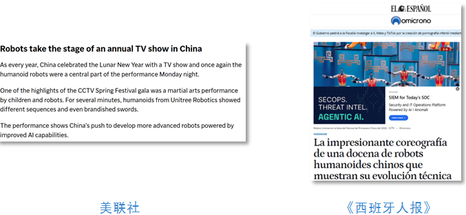 美联社在题为《新年祈福、机器人和各种庆祝活动迎接马年的到来》的报道中表示,人形机器人再次成为春晚演出的核心部分。人形机器人的这次参演展现了中国致力于研发由人工智能技术提升驱动更先进机器人的决心。《西班牙人报》网站刊发题为《十几台中国人形机器人精彩的表演展现了技术的进化》的文章,感叹中国在机器人领域正在发生的一切事情,几乎可以称之为一场真正的革命。仅用一年时间,中国的人形机器人就可以完成各种特技表演。