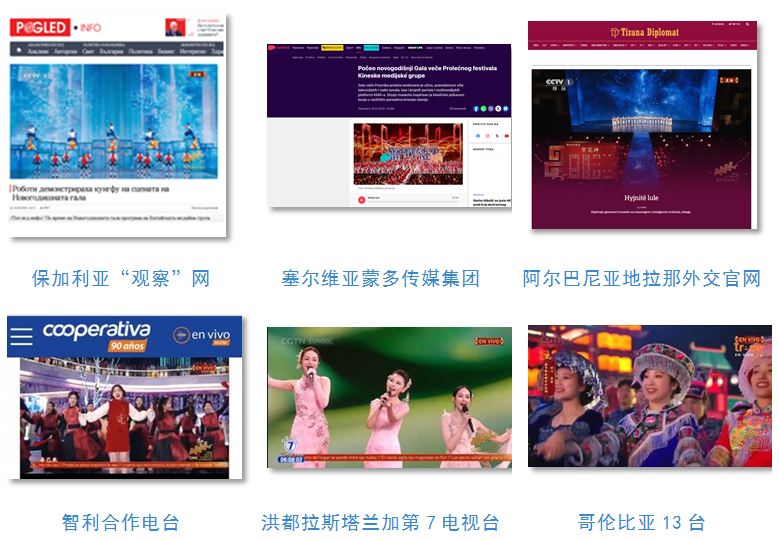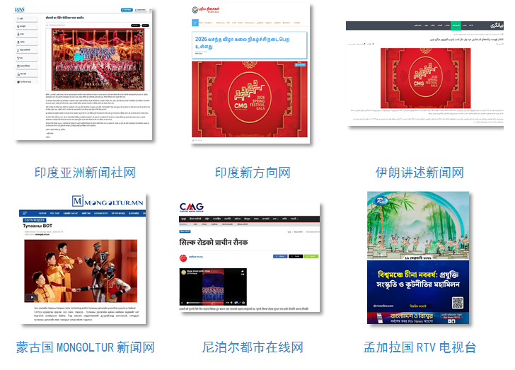 总台通过85种语言传播平台快速编译播发多语种特稿。《武BOT》《丝路古韵》《喜雨》《踏地为节》《吉量》《绘新春》等机器人、舞蹈、杂技等节目,向世界充分展现中华文化新意绽放与科技智造硬核实力。相关报道被法国BFM电视台官网、意大利埃瑞亚通讯社、《欧洲时报》德文网、葡萄牙《南方日报》、日本共同社、巴西旗手电视台、波兰媒体协会官网、保加利亚“观察”网、塞尔维亚蒙多传媒集团、克罗地亚今日奥西耶克网、印度亚洲新闻社、泰中新闻网、伊朗讲述新闻网、蒙古国MONGOLTUR新闻网、尼泊尔都市在线网、孟加拉国RTV电视台等海外主流媒体广泛转载转发。