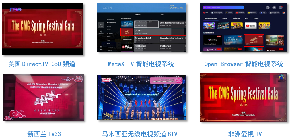 春节,是中华文明绵延千年的文化符号,是全球华人血脉相连的精神纽带。作为全球收视规模最大的年度文化盛事,总台春晚已成为全球华人和海内外朋友情感共鸣的“精神年夜饭”。央视中文国际频道推出4小时直播特别节目《传奇中国节·春节》,并通过海外社交平台账号同步直播。除夕当晚,CCTV中文国际亚洲、欧洲、美洲频道,华语环球广播,南海之声全程直播总台春晚,同时联动美国蒂斯欧电视、MetaX TV、美国碟网卫星电视、加拿大泰勒斯传媒、加拿大贝尔卫星电视、法国布依格电信、法国电信、新加坡mewatch、新加坡电信、马来西亚电信、南非DSTV等32家海外平台同步视音频直播。海外华人华侨称赞总台春晚不仅是连接全球华人的精神纽带和文化盛宴,更向世界打开了一扇了解中华优秀传统文化、了解新时代中国万千气象的窗口。