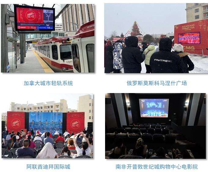 千屏闪耀“春晚红”。全球98个国家140座城市共计4062块公共大屏直播和宣介总台春晚。加拿大城市轻轨系统、俄罗斯莫斯科马涅什广场、南非开普敦世纪城购物中心电影院、阿联酋迪拜购物中心、阿联酋迪拜国际城等多地大屏实时直播总台春晚,精彩纷呈的节目赢得现场观众阵阵掌声。
