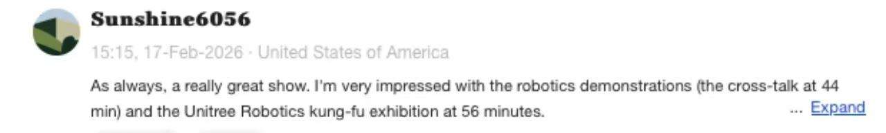 英语网友Sunshine6056:一如既往,这是一场非常精彩的演出。我对机器人演出的小品以及宇树机器人展示的功夫表演印象尤为深刻。