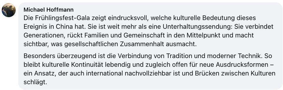 德国网友霍夫曼:总台春晚这一文化盛事不仅是综艺节目,更连接代际、家庭与社会,凸显着社会的凝聚力。晚会传统与现代科技的结合令人震撼,这一融合发展理念有助于推动文明交流互鉴。