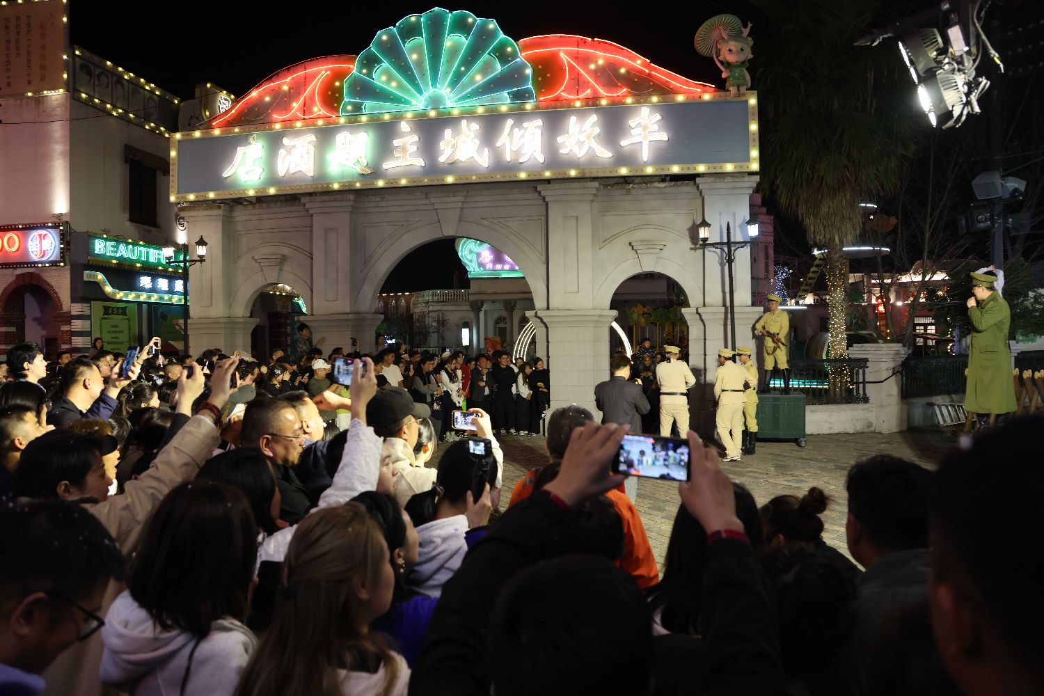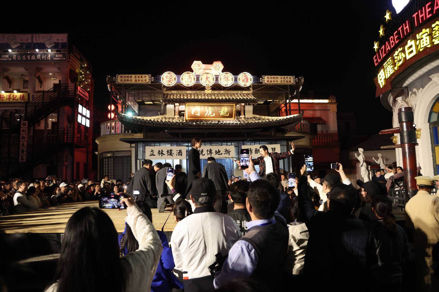 夜色中的横店,灯火流转,人影交织。
