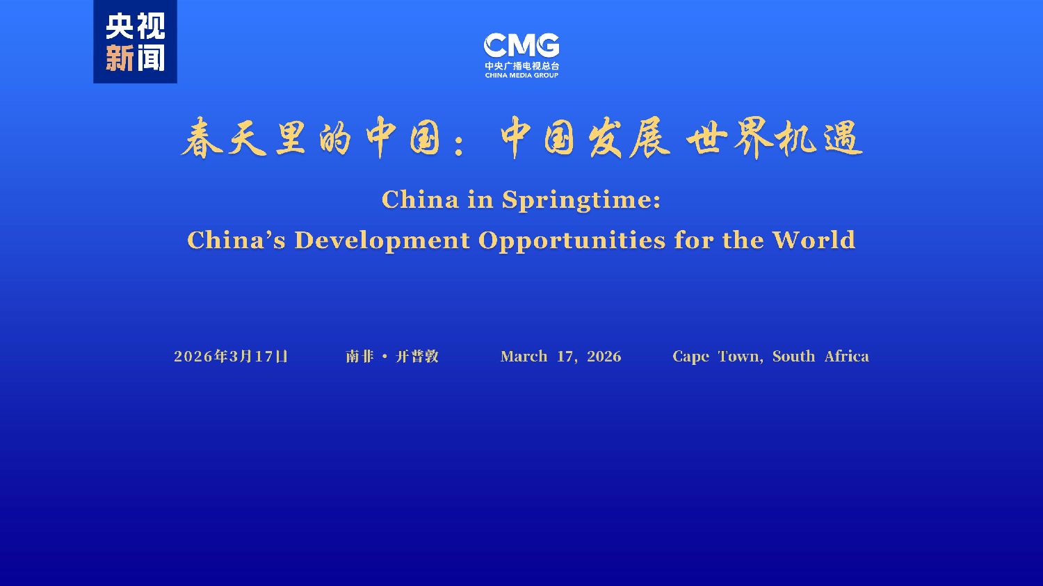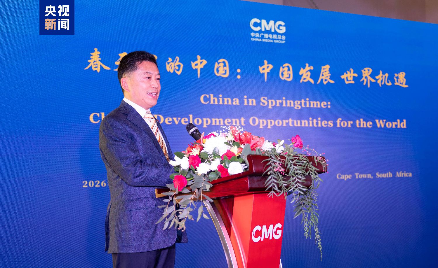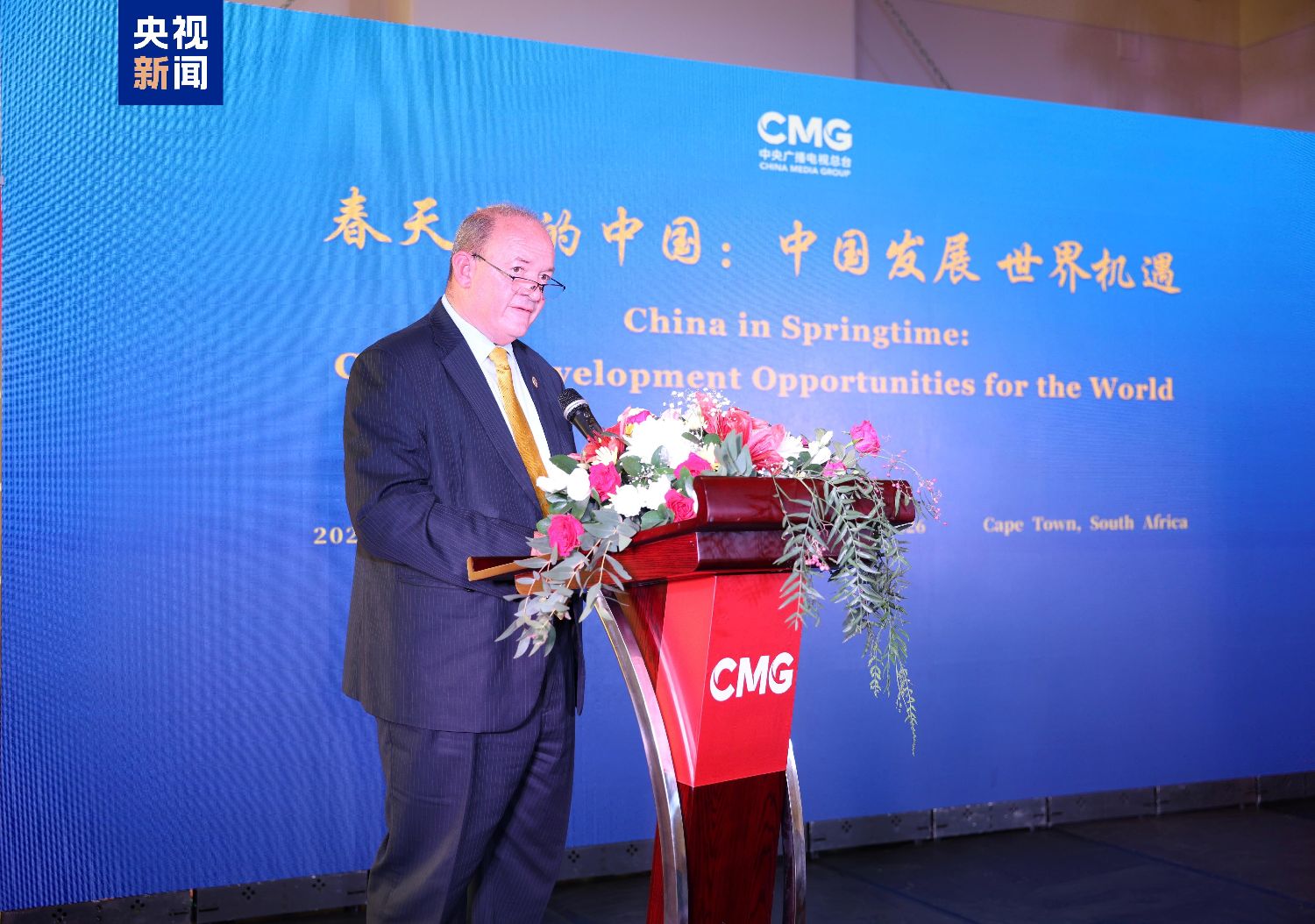 当地时间3月17日,由中国中央广播电视总台主办的“春天里的中国:中国发展世界机遇”全球对话会南非专场在开普敦举行。中宣部副部长、中央广播电视总台台长慎海雄作视频致辞,中国驻开普敦总领事任发强、南非省务院副主席莱斯·戈文德、西开普省议会议长戴林·米切尔、南非国际关系与合作部亚洲与中东事务司代理副总司长戴维·马尔科姆森等嘉宾出席活动并致辞。南非政界、学界、媒体界以及青年学生代表等近百名嘉宾参加活动。
