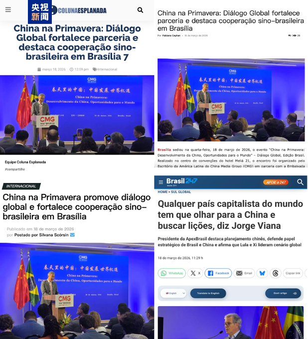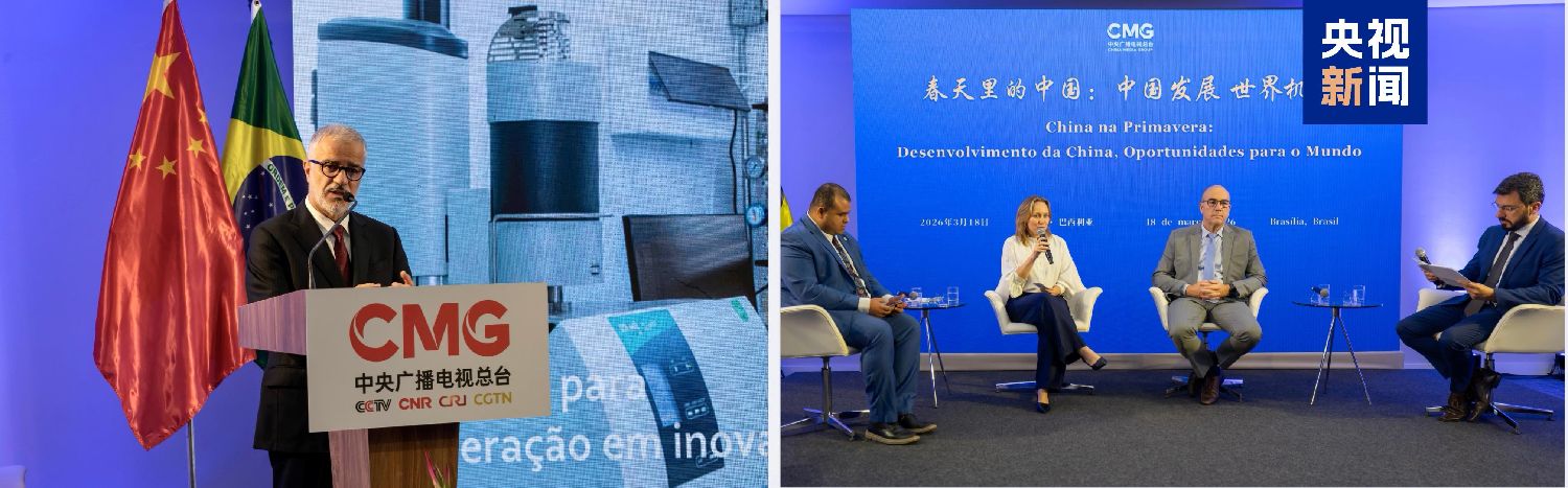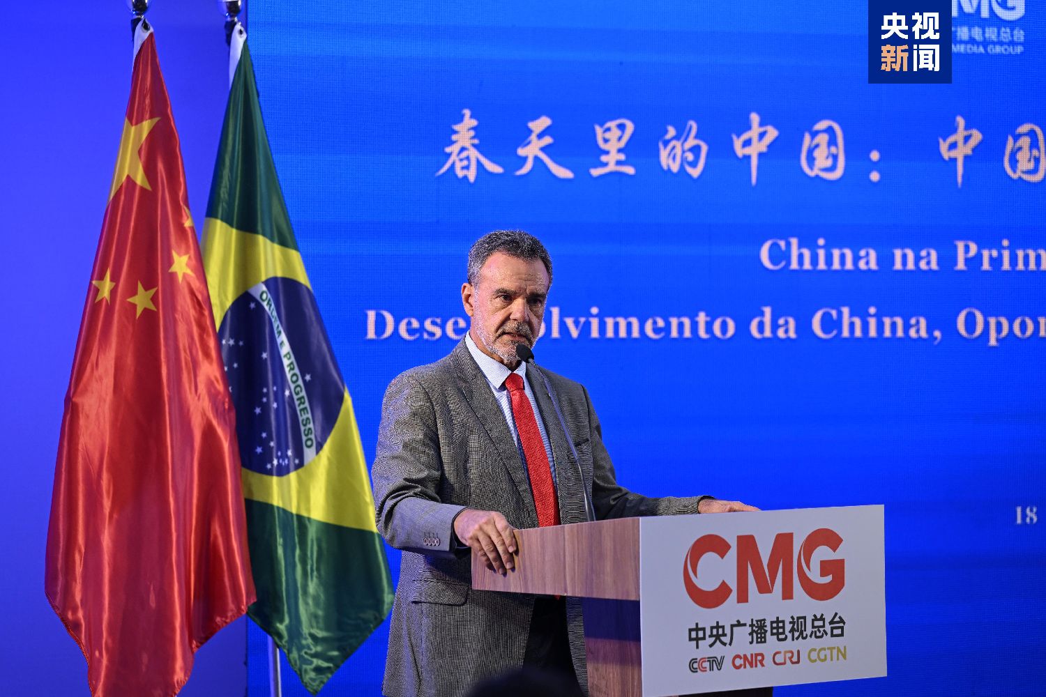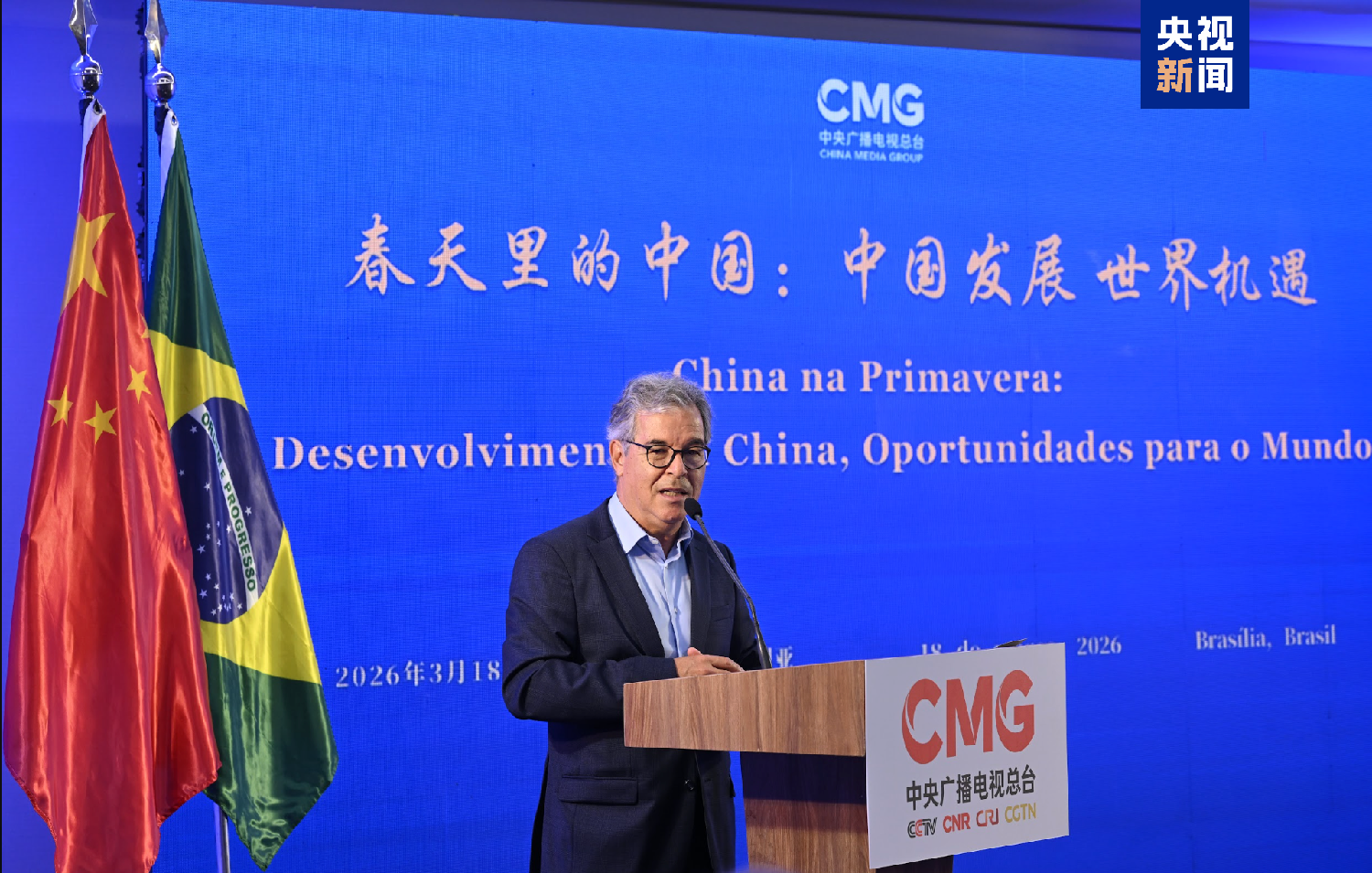 当地时间3月18日,由中国中央广播电视总台与中国驻巴西大使馆共同主办的“春天里的中国:中国发展世界机遇”全球对话会巴西专场在巴西利亚举行。中宣部副部长、中央广播电视总台台长慎海雄,巴西卫生部长亚历山大·帕迪利亚作视频致辞。中国驻巴西大使祝青桥、巴西总统府机构关系部执行秘书马塞洛·科斯塔、巴西总统府新闻事务部特别顾问马尔科·科诺帕基、巴西总统府总秘书处全国青年秘书处国务秘书维多利亚·热努伊诺、巴西联邦众议员兼众议院巴中议员友好小组主席丹尼尔·阿尔梅达、巴西出口投资促进局主席若热·维亚纳出席活动并致辞。巴西政界、商界、学界、媒体界等约120位嘉宾参加活动。