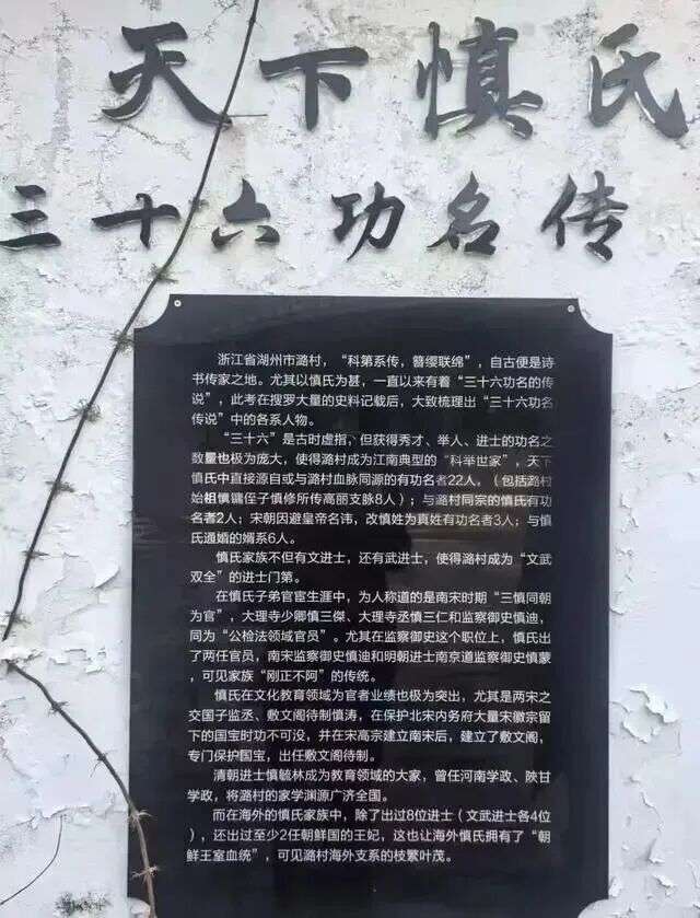 至神宗朝,宋神宗命慎镛侄子慎修出使韩国,由于宋金战乱,慎修滞留高丽,后担任高丽王朝重臣,湖州潞村也成为5万多名韩国慎氏后裔之根。如果说他的先人们受两朝厚待已是少数,像他这样“跨国履职”后又在驻在国被重用的,更是罕见。