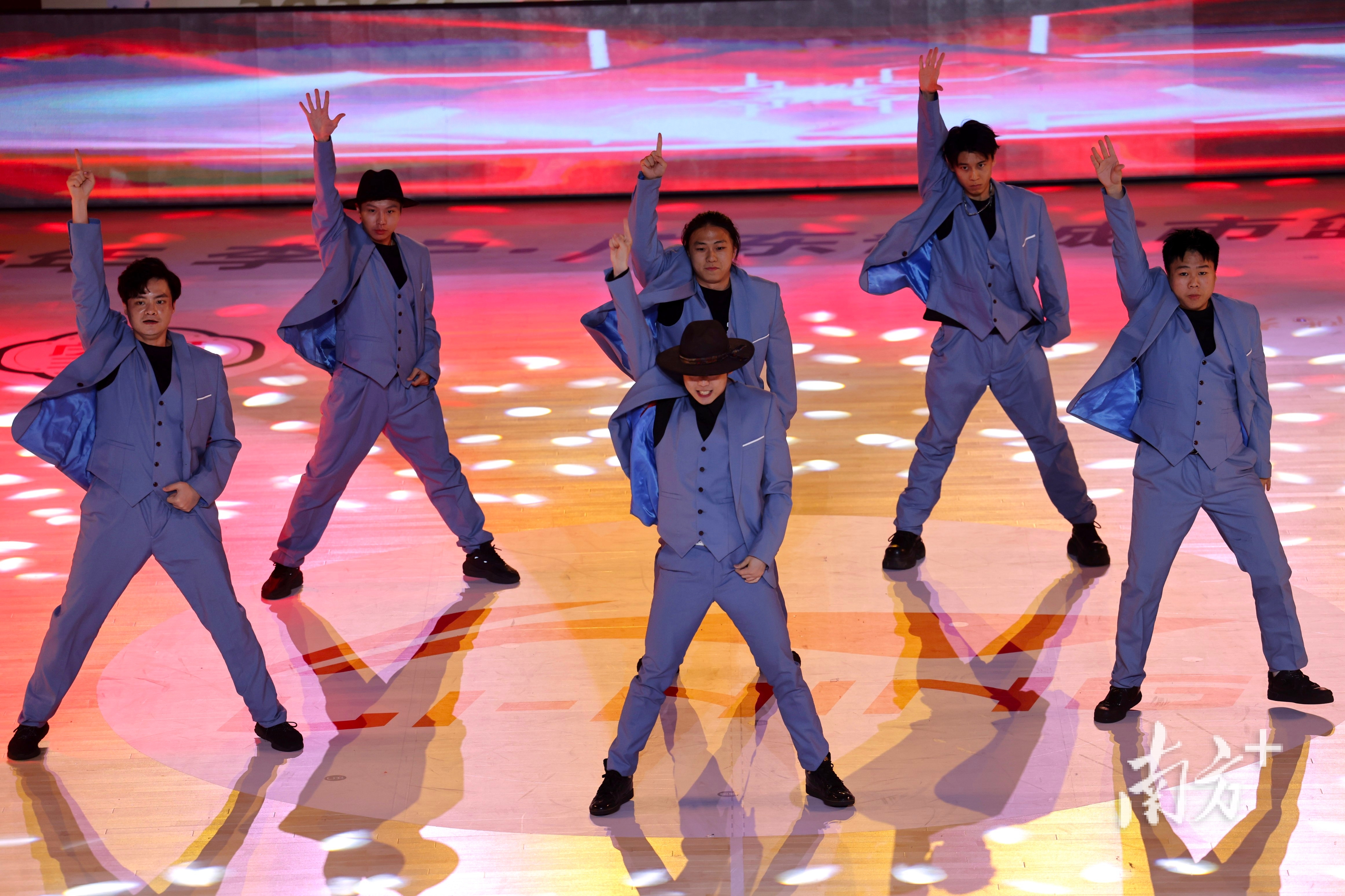 十五运会的吉祥物“喜洋洋”“乐融融”返聘再上岗,今年成为了粤BA的吉祥物。30多只可爱的“大湾鸡”在现场可爱舞动,再次萌翻现场。在可爱的英歌女孩的带领下,现场还上演一段热血的英歌舞,为赛场氛围再度加码。此后登场的花式篮球、街舞、歌曲《气势如虹》的表演,都让现场变得格外热烈。