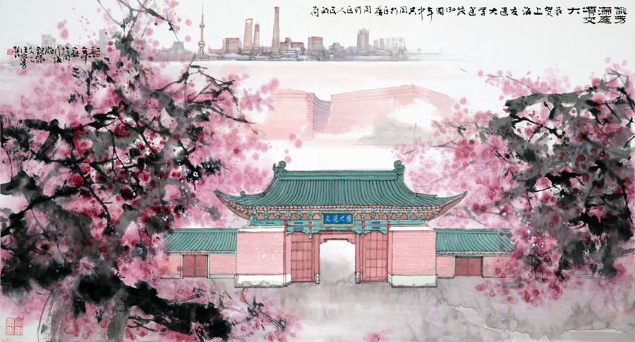 《桃芳满庭颂交大》由中国美术家协会理事、一级美术师汪家芳创作,整幅画心尺寸达180×97厘米。作品以传统中国画为载体,巧妙地将上海交大标志性校门、盛放桃花、大零号湾科创地标与上海城市天际线融为一体,既镌刻着百年学府的深厚底蕴,也勾勒出城区蓬勃向上的时代气象,实现了历史厚重感与时代鲜活感的完美交融。