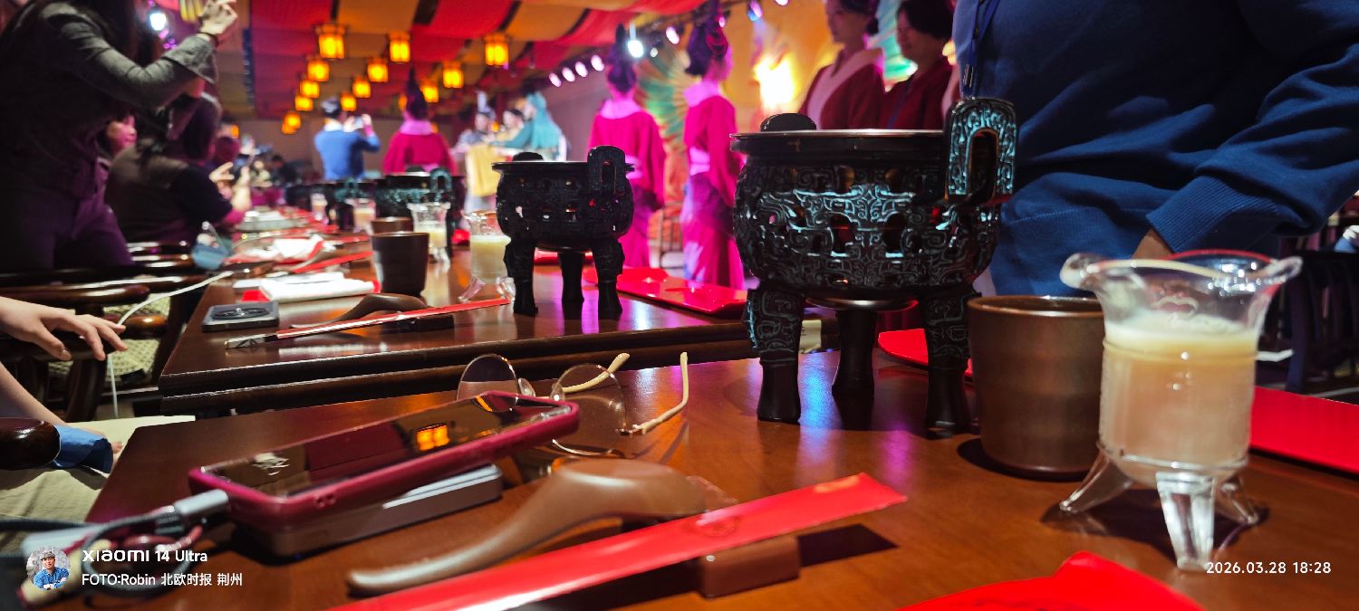 桌上摆放着仿青铜器的餐具,热气升腾,楚菜的香味扑面而来。
