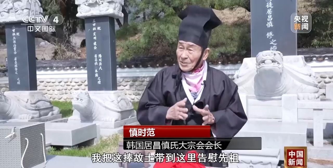 韩国居昌慎氏大宗会会长慎时范:我把这捧故土带到这里告慰先祖。中国亲人送给我们一幅字,上书“同源同宗守望相助”,我们来自同样的根,更应承先祖庇佑、携手同行。