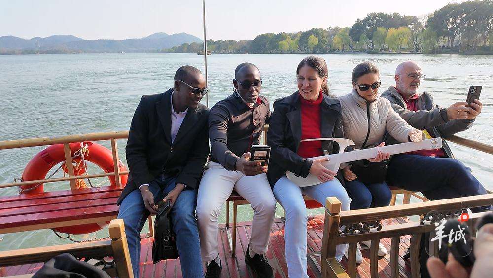 赫列娜在西湖上与同行的外媒记者弹唱受访者提供