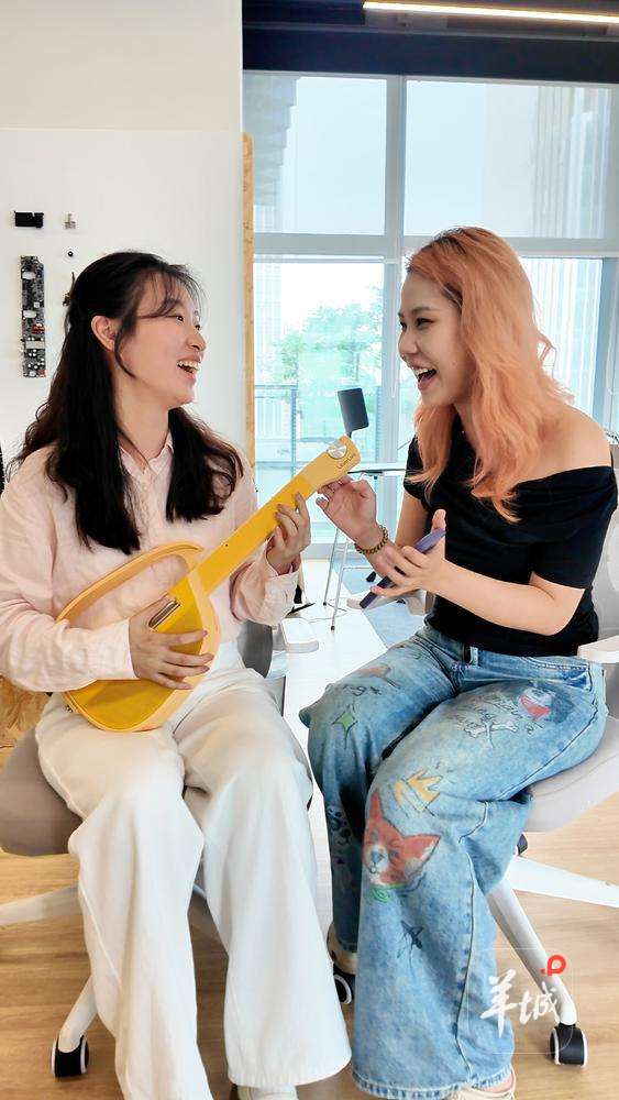记者刘泳希与Liberlive产品经理李嘉欣一起弹琴。羊城晚报记者温泽广摄