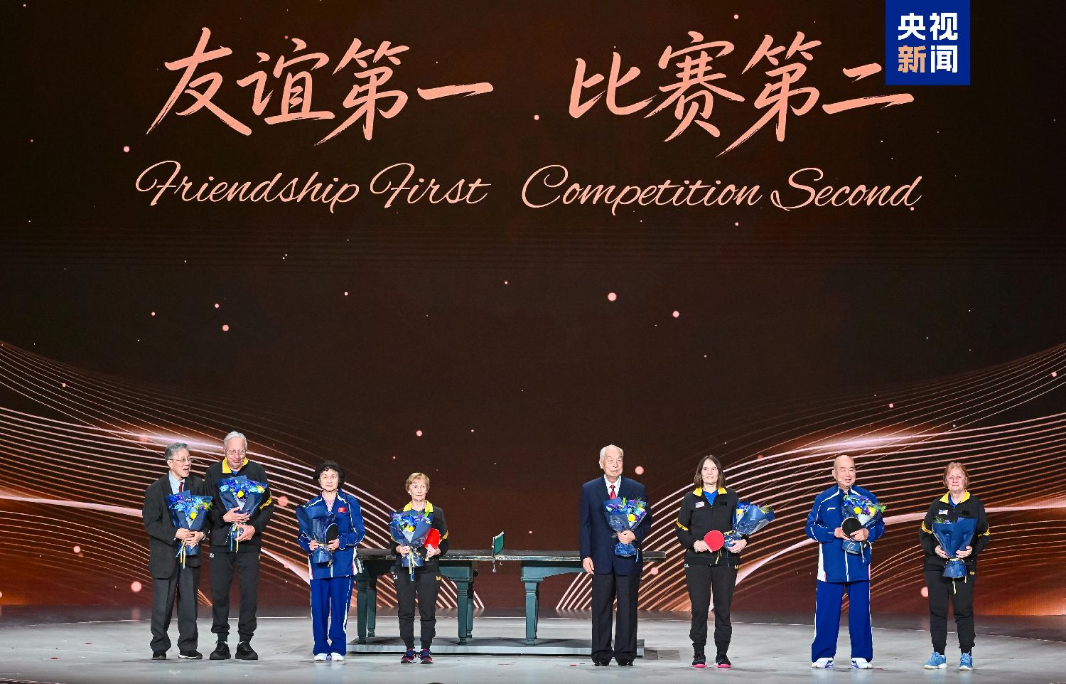 纪念大会上,梁戈亮、郑敏之、康妮·史维利斯、朱迪·霍夫罗斯特等中美“乒乓外交”亲历者同台,深情回望55年前那段跨越山海的乒乓情缘,娓娓道来“小球转动大球”背后的动人故事。随后,他们再次挥拍展开“友谊之球”表演赛,将现场观众拉回55年前那个打破隔阂、传递善意的历史瞬间。表演赛结束后,多位当年“乒乓外交”的亲历者上台接受青少年代表献花。这一幕,既是对历史的致敬,也象征着“乒乓外交”精神在年轻一代手中的传承与延续。