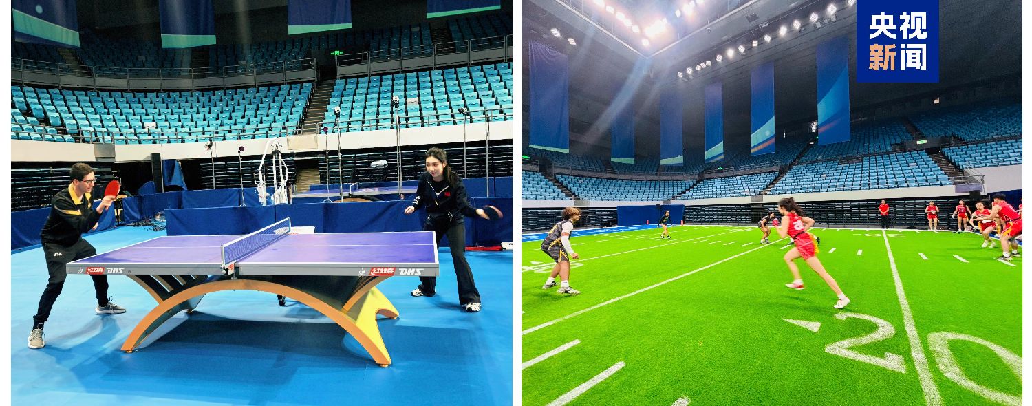 在乒乓球与橄榄球跨项目互动体验区,中国乒乓球名将邓亚萍、张怡宁、马龙、阎森与美国国家橄榄球联盟球员代表、美国女子腰旗橄榄球队代表及华盛顿州塔科马市林肯中学腰旗橄榄球队队员,分别展开乒乓球对练、橄榄球互动。双方互赠签名乒乓球拍与签名橄榄球,以体育信物传递友好情谊。