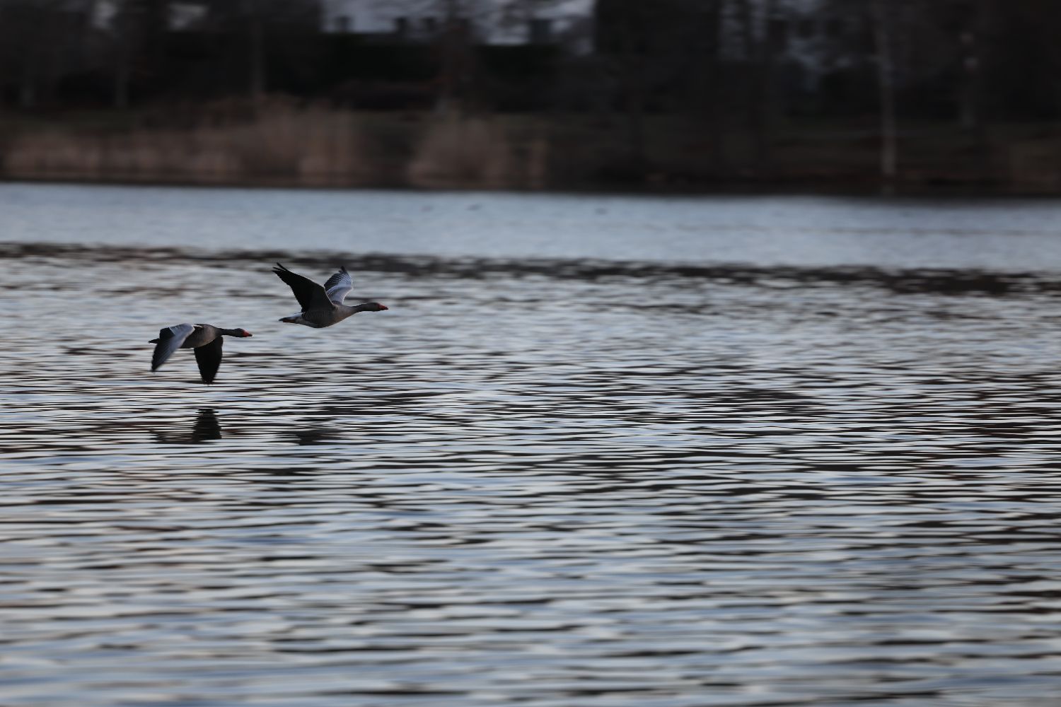夜色渐沉,湖面微光浮动。