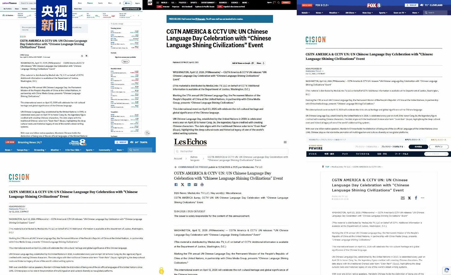 截至目前,联合国中文日“翰墨和鸣华章同赋”主题文化活动相关报道被包括美联社、雅虎财经、FOX、NBC等在内的美国、英国、加拿大、法国、德国、日本、韩国、新加坡、印度等全球48个国家和地区的1127家主流媒体转载转引。