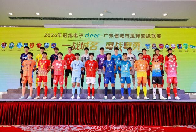 在吹风会现场,21个地市代表队的队徽和比赛服逐一展示。各具地域特色的设计充分展现出广东百花齐放的足球文化与深厚绵长的足球底蕴。组委会特邀容志行、池明华、彭伟国、郜林四代广东足球名宿现场为2026粤超打Call。