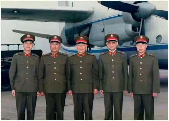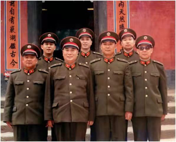 图为时任广州军区特运办事处政治委员的覃振勤(后排中)和广州军区特运办事处主任董兆良(前排右一)于1988年接待时任广州军区司令员张万年(前排左二)、广州军区副参谋长曲长君(前排右二)、广州军区司令部顾问毛余(前排左一)时合影留念。