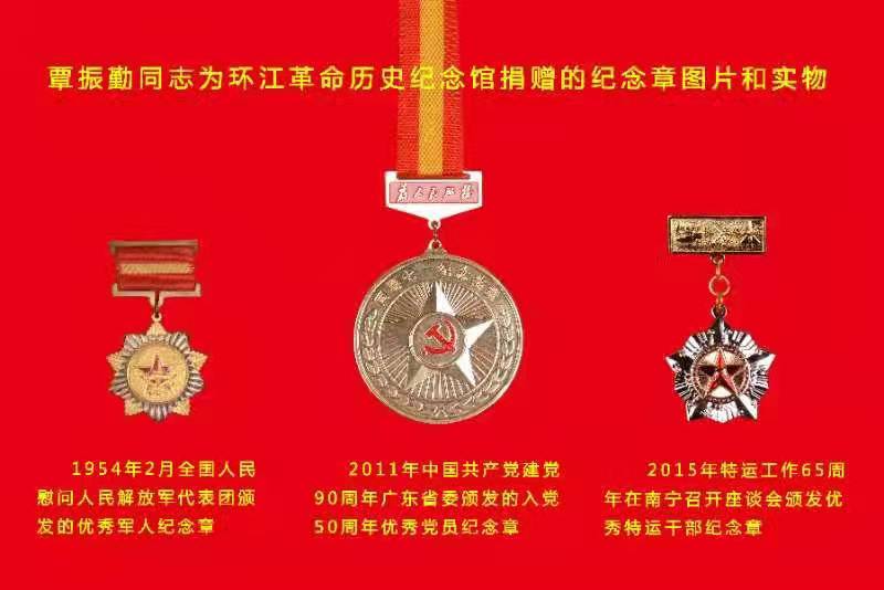 荣誉榜单上,对于辛勤付出与收获的覃振勤来说,硕果累累。1953年7月抗美援朝战争结束后,1954年春节获得全国慰问人民解放军纪念章一枚;2011年7月1日,欣逢中国共产党成立90周年华诞到来之际,覃振勤荣获中共广东省委授予“入党50周年”荣誉纪念章1枚;2015年,广州军区特运工作65周年座谈会在广西南宁召开,覃被评为“优秀特运干部”,荣获纪念章1枚;2021年7月1日,在中国共产党诞生100周年到来之际,覃振勤荣获中共中央授予“光荣在党50年”荣誉纪念章1枚。