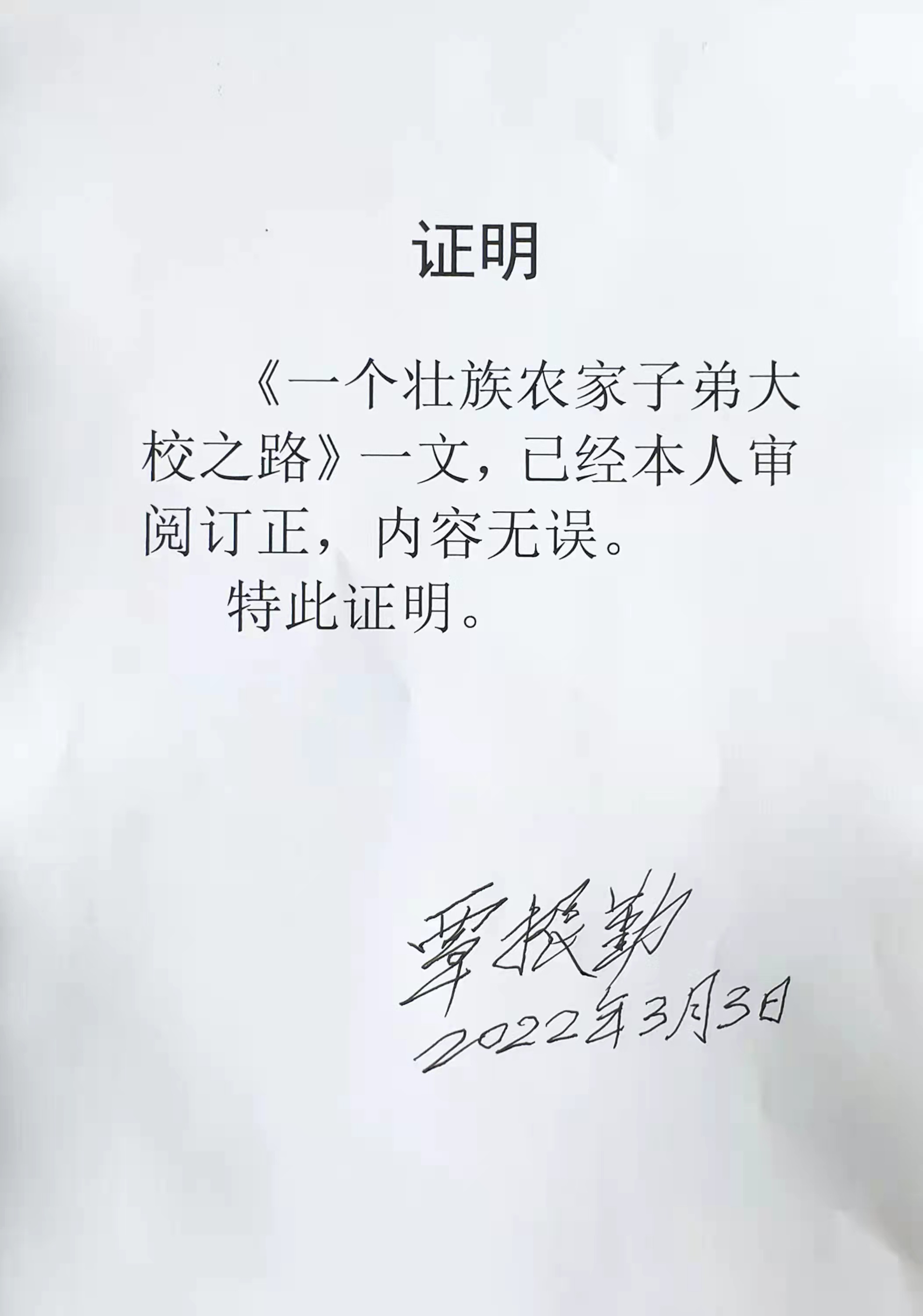 父母懵了,覃振勤也呐闷。后经查证,原来是监考老师把考卷号弄错了——把答对了的考卷试题,写成了另外一个学生的姓名。由于录取新生工作已告一段落,“木已成舟”,覃振勤只能忍受错号而造成的苦楚与冤屈。