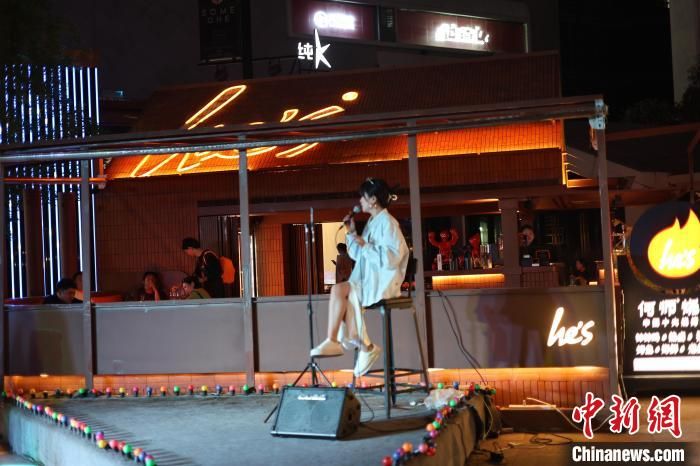 图为一女歌手在大九街唱歌。 李可怡摄