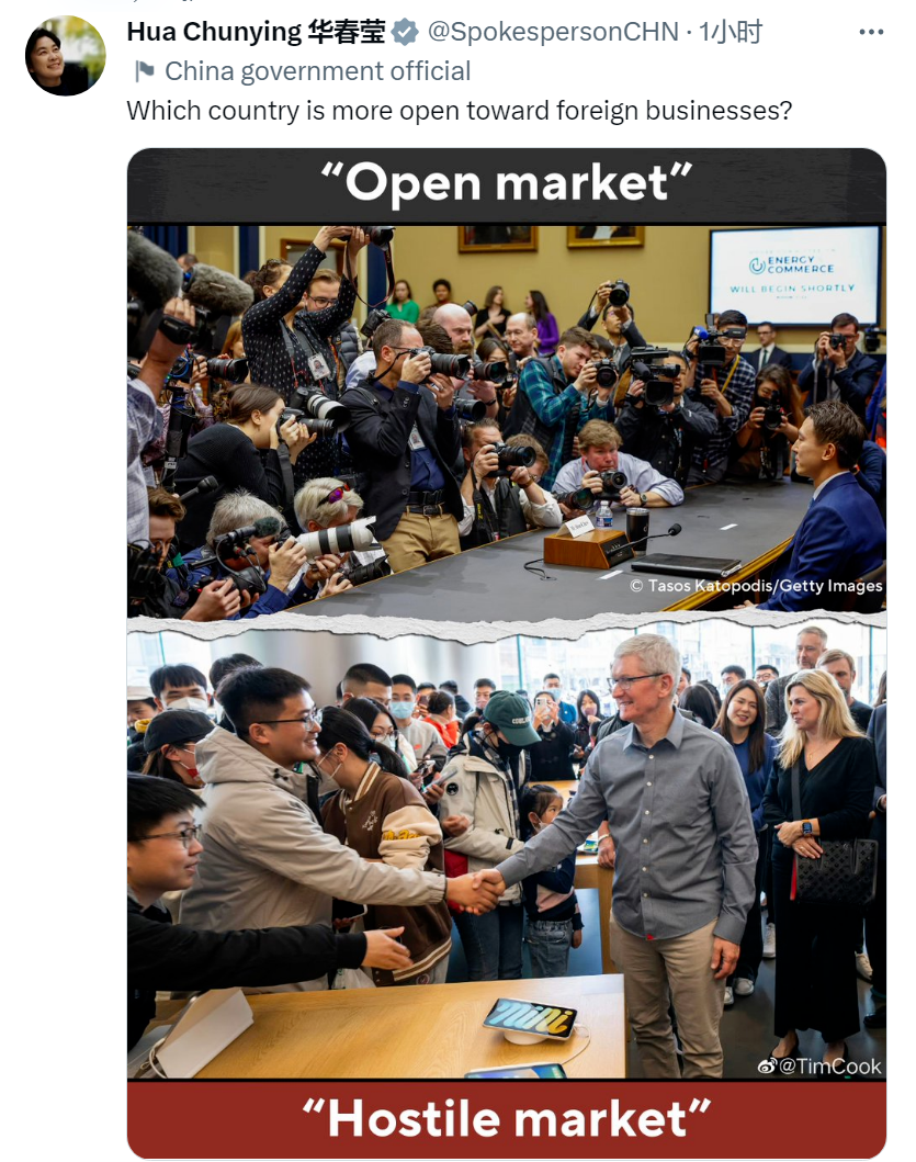 不久前,中国外交部部长助理、发言人华春莹在社交媒体晒出一组对比图:一边是TikTok首席执行官周受资在美国听证会面对长枪短炮、遭遇无礼盘问,一边是美国苹果公司CEO库克来华出席活动受到热烈欢迎。她问:“哪个国家对外企更开放?”
