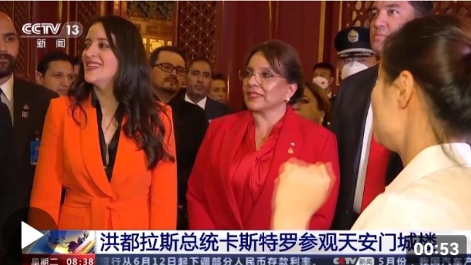 在参观完有关天安门历史的展览之后,卡斯特罗总统写下留言,她说:“第一位到访和认识新中国的洪都拉斯人是左翼作家拉蒙·阿马亚·阿马多尔,他在1952年访问中国,并登上天安门,今天又有一位洪都拉斯女总统,来到了这里,这是个千年历史与新中国现代文明的融合之地。”(总台央视记者孔琳琳聂继承)