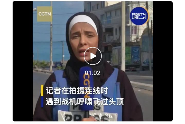 总台报道员努尔·哈拉辛,在加沙地区进行直播连线时,头顶军机呼啸而过。她采访了当地多位巴勒斯坦居民,并发回街头民众排队抢购物资的情况。