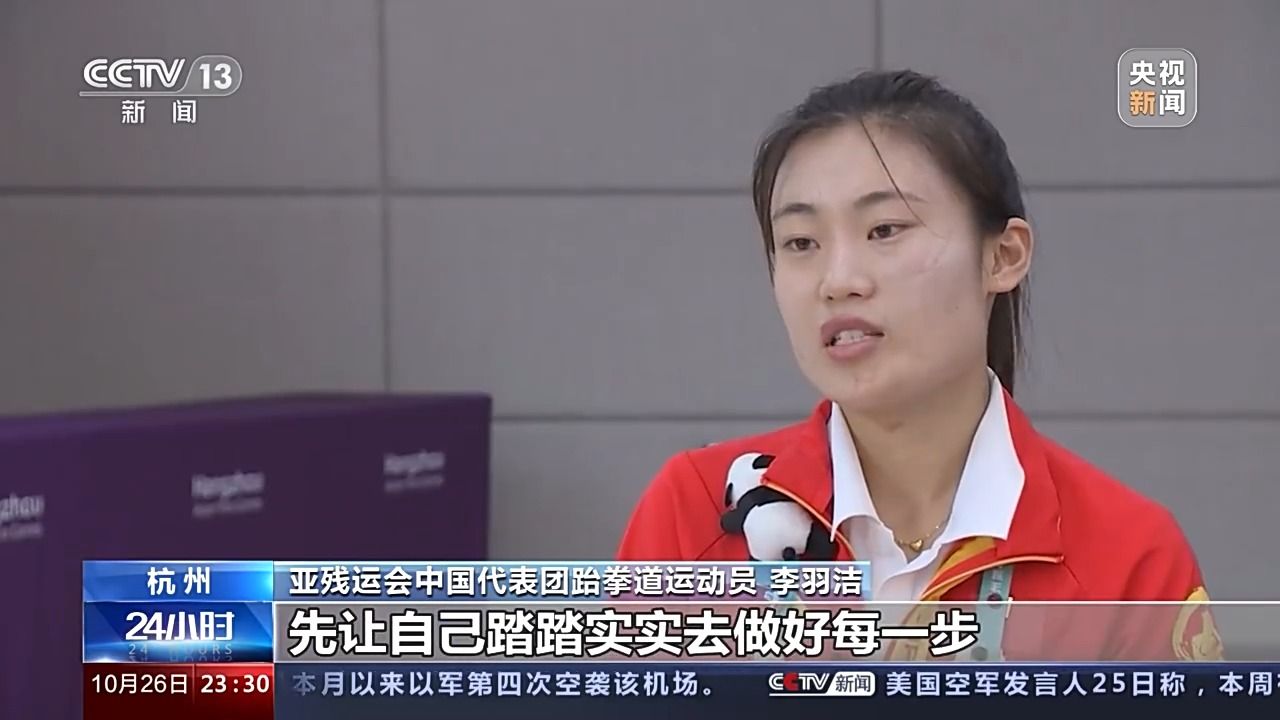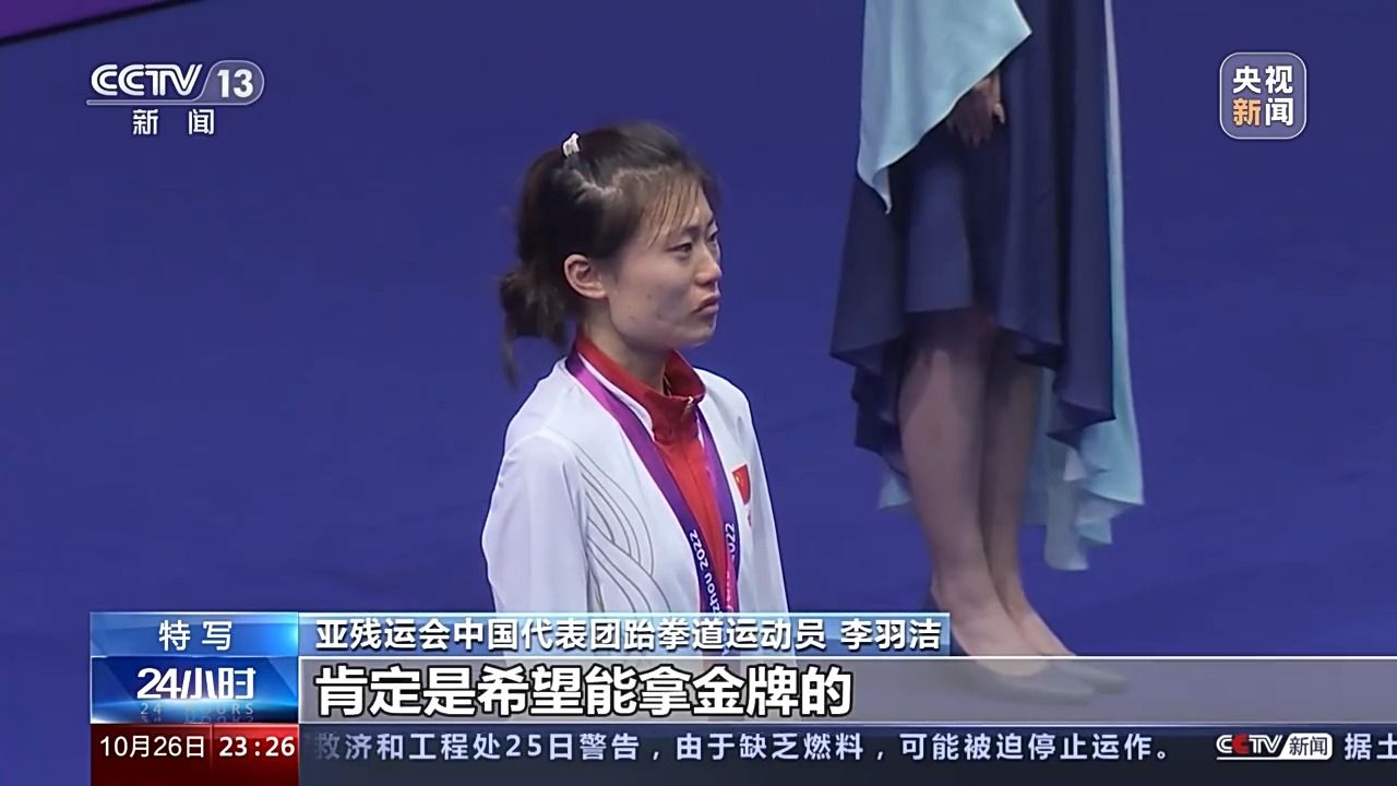 亚残运会中国代表团跆拳道运动员 李羽洁:肯定是希望能拿金牌的,在自己国家多么不容易的一次机会,就是惜败一分,还是要继续备战,要争取12月份能够顺利地参加世界残疾人跆拳道大奖赛,还想再搏一搏。