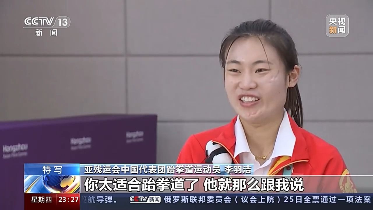 亚残运会中国代表团跆拳道运动员 李羽洁:当时教练跟我说,你听我的,你就应该练跆拳道,你太适合跆拳道了,他就那么跟我说。然后他指着我说,我一定要把你带成世界冠军,这颗种子就已经埋在心里了。