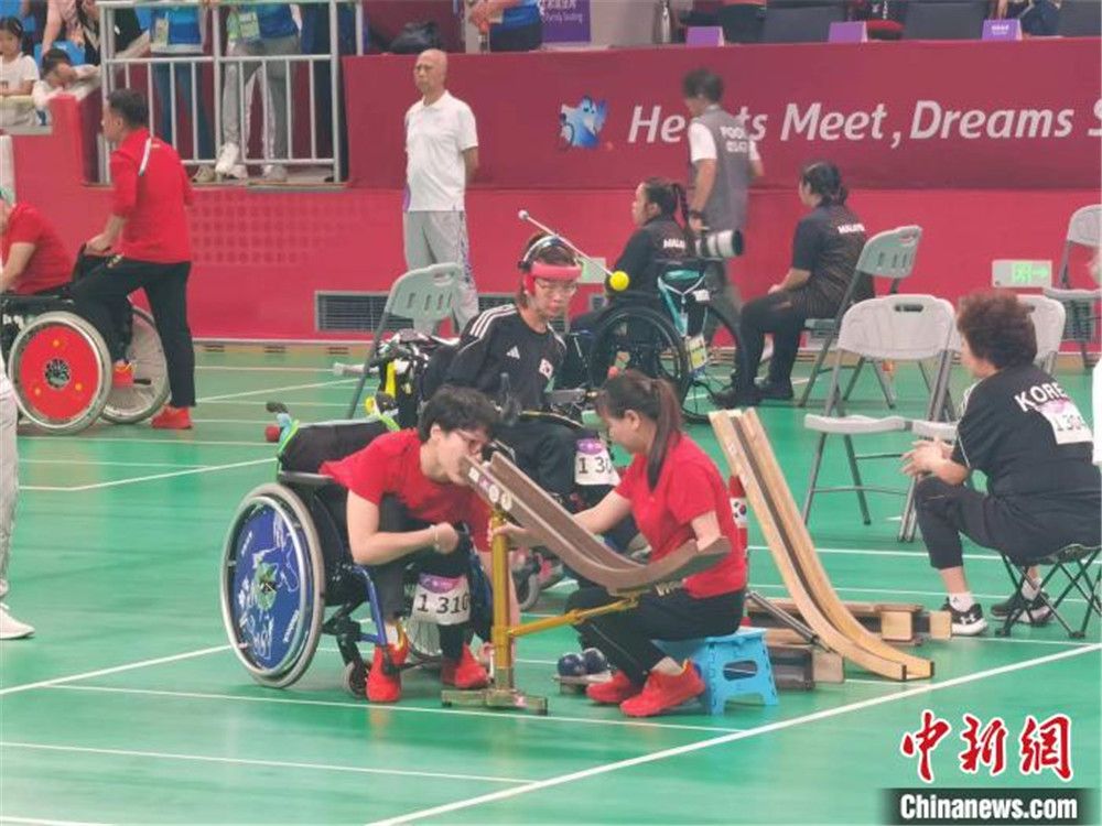 何丽萍就是杭州第4届亚残运会中国代表团硬地滚球BC3级选手杨贝贝的轨道操作员。按照竞赛规则,何丽萍需始终背对赛场,待杨贝贝决定出球方式后,再根据其需求调整好轨道的方向、长度、高度,并将球置于指定的轨道位置上,辅助杨贝贝完成最后的出球。
